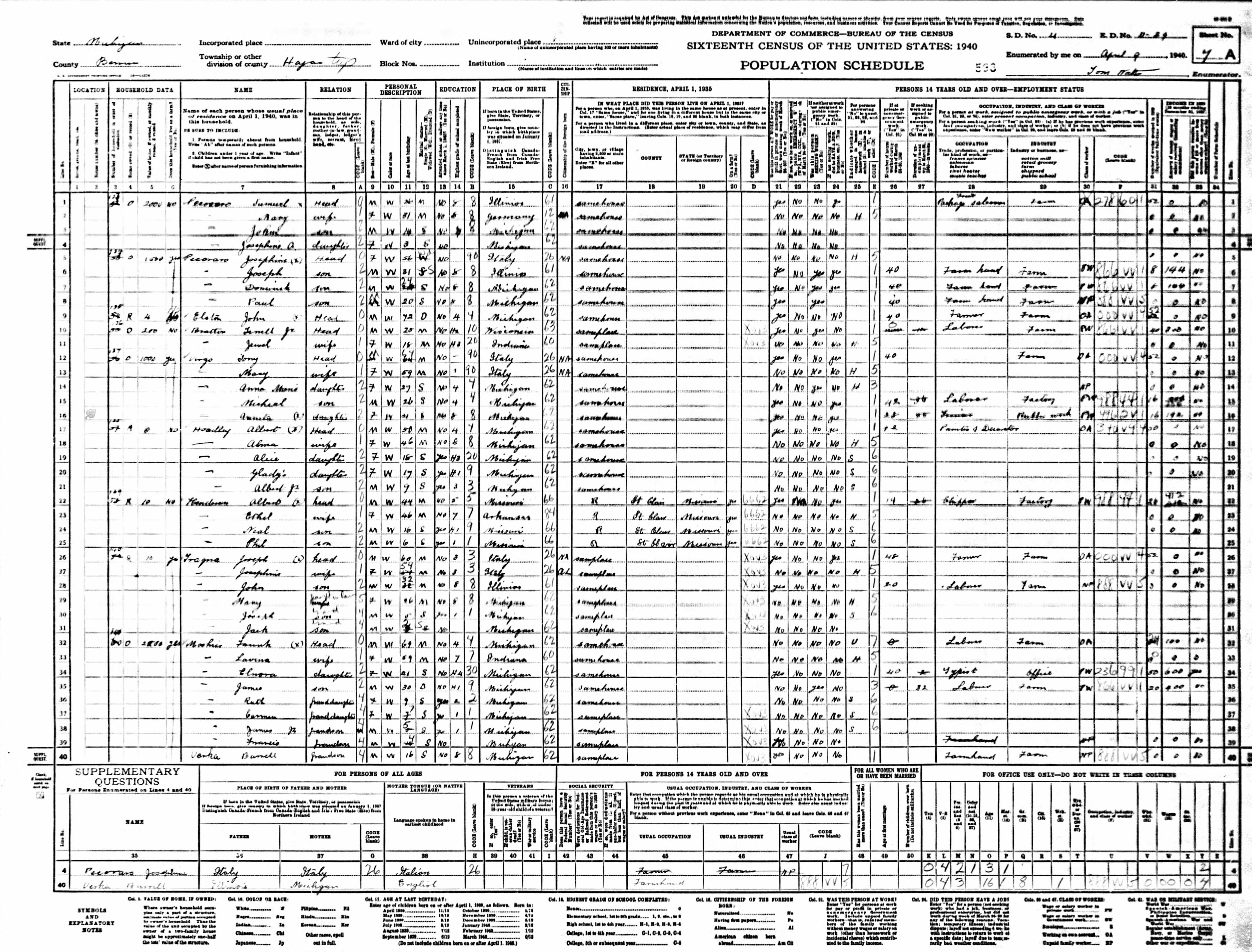 Pecoraro Family 1940 Federal Census Michigan, Lines 1-8