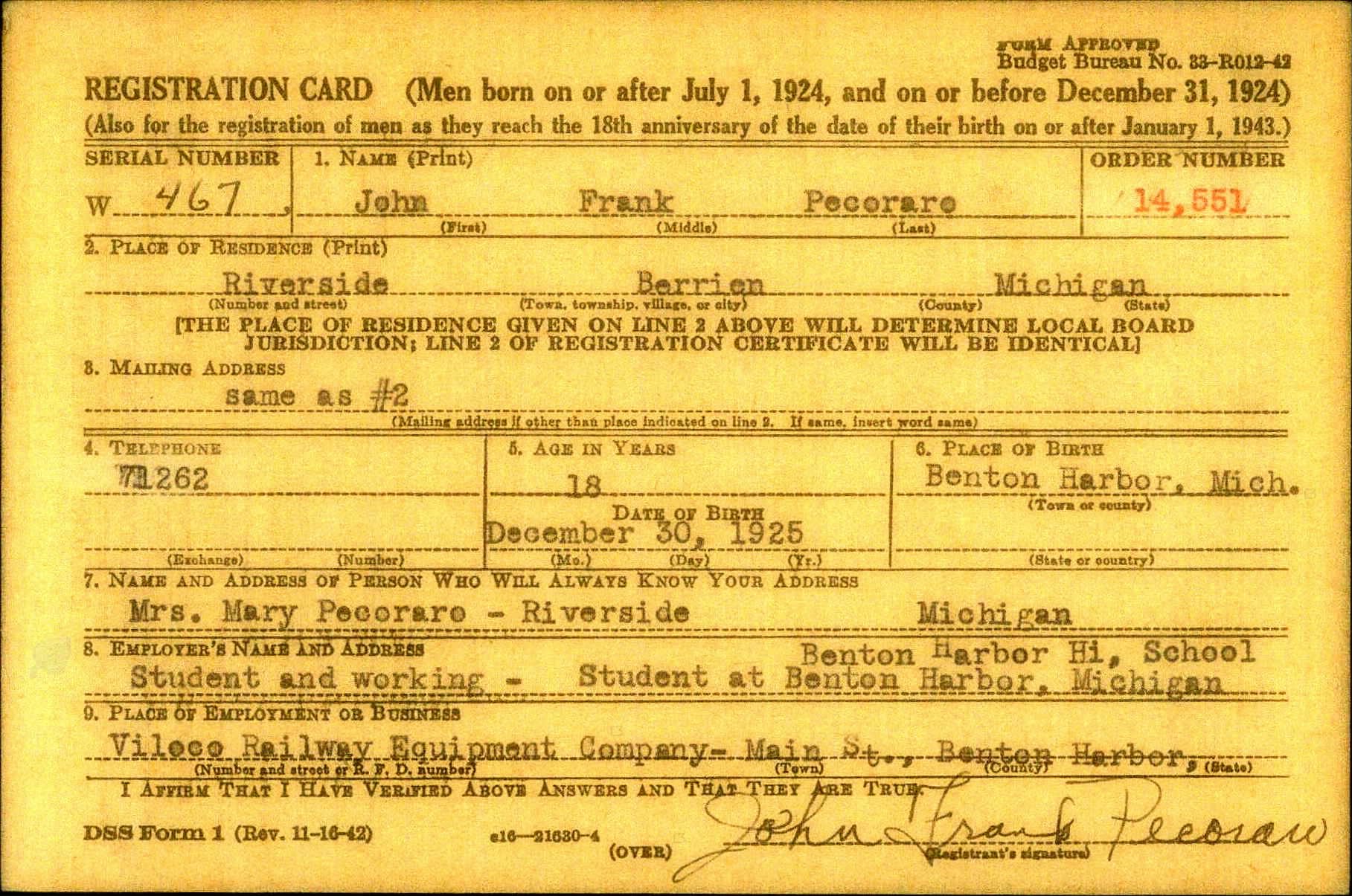 John Frank Pecoraro was born on December 30, 1925 in Benton Harbor, Berrien, Michigan, USA.