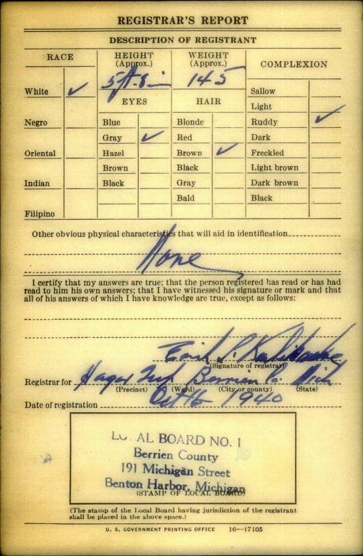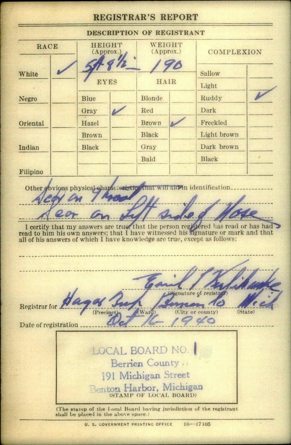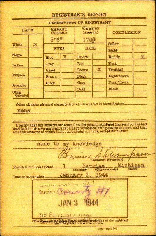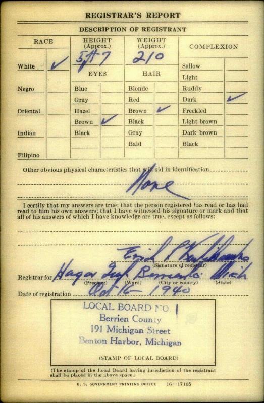 Marietta Shrieber were married on August 31, 1940 in Benton Harbor, Berrien, Michigan, USA. He died on November 20, 1951, at age 36, in Benton Harbor, Berrien, Michigan, USA.