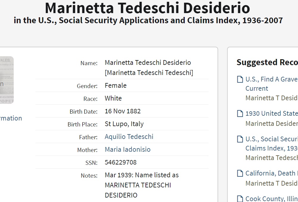 Marinetta Annuziata Tedeschi was born on November 15, 1882 in San Lupo, Benevento, Campania, Italy. She and