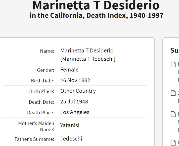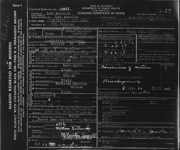 Marinetta Annuziata Tedeschi were married on November 27, 1904 in San Lupo, Benevento, Campania, Italy. He died on September 22, 1937, at age 58, in Los Angeles, California, USA. He was buried in Forest Lawn Memorial Park, Glendale, California.