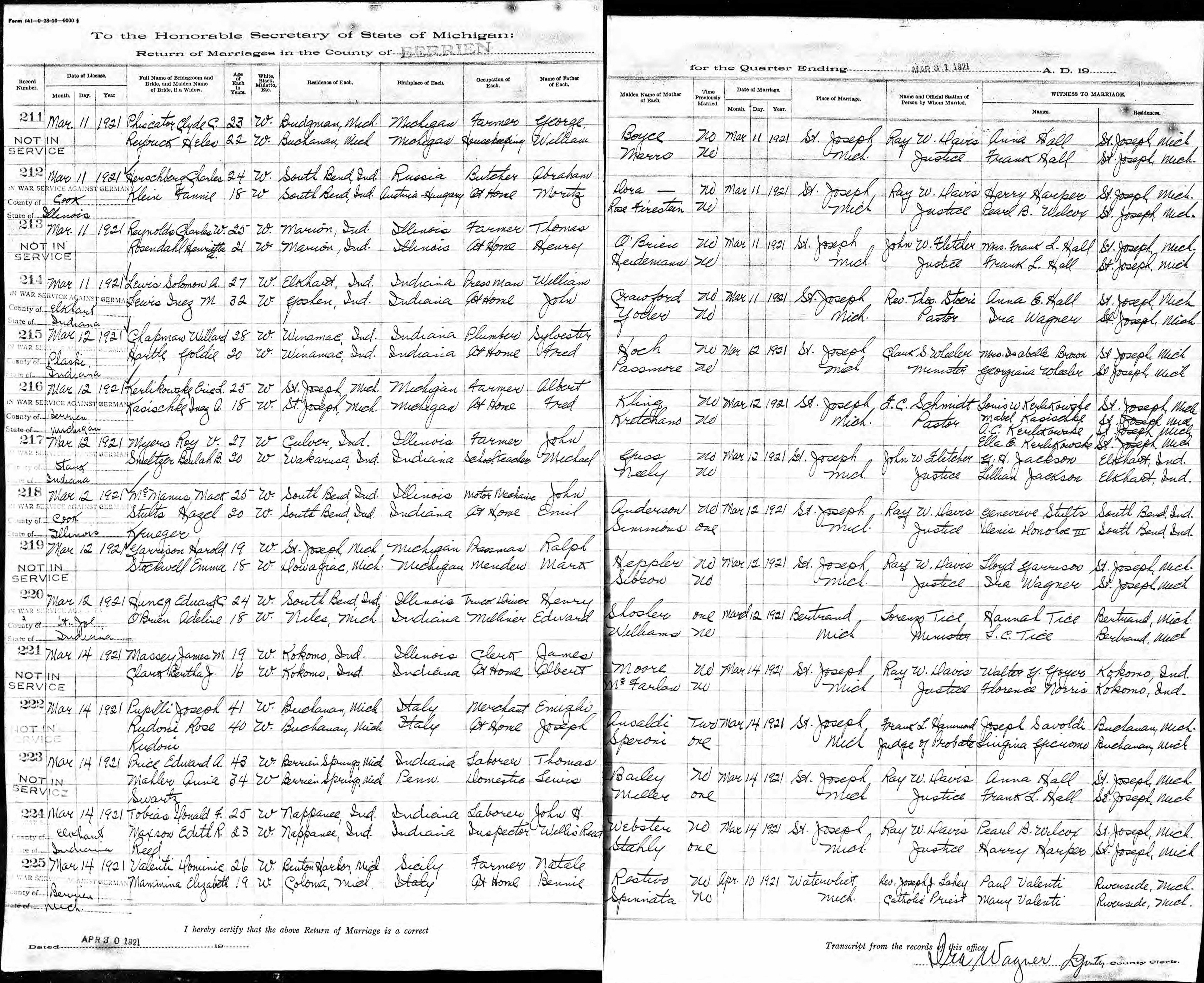Elizabeth Mammina were married on April 10, 1921 in Watervilet, Berrien, Michigan, USA. He died.