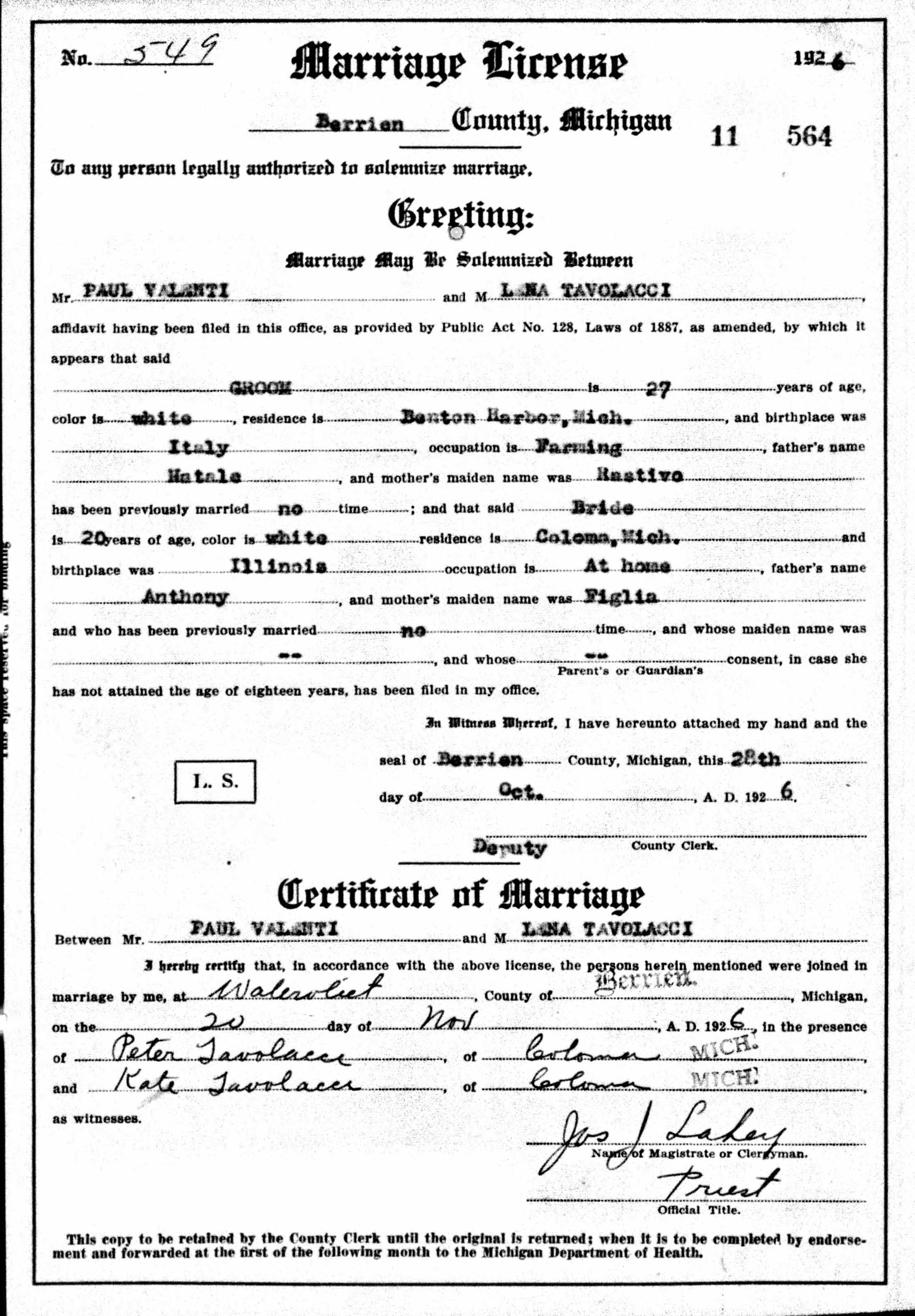 Lena Tavolacci were married on November 20, 1926 in Watervilet, Berrien, Michigan, USA. He died.