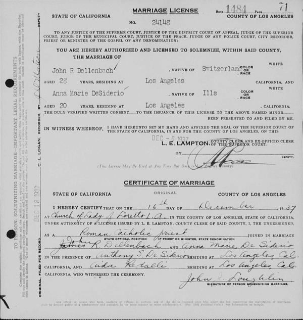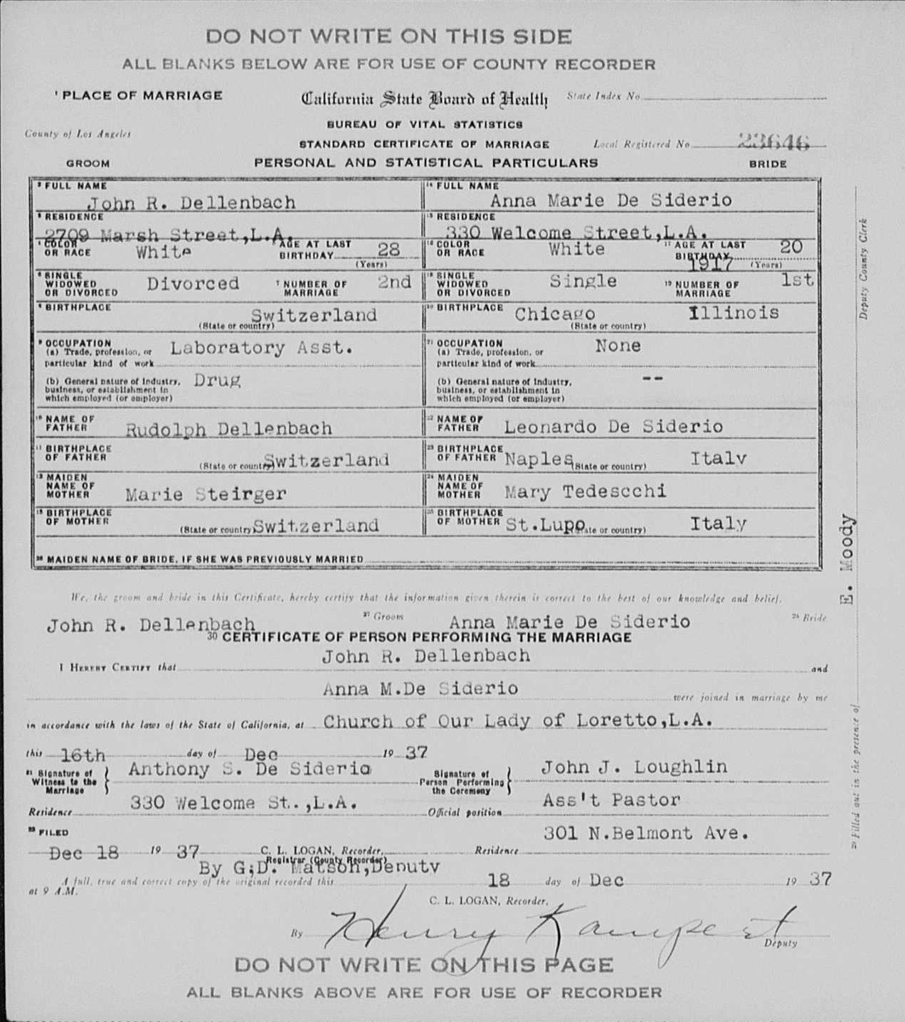 John R. Dellenbach were married on December 16, 1937 in Los Angeles, California, USA. She died.
