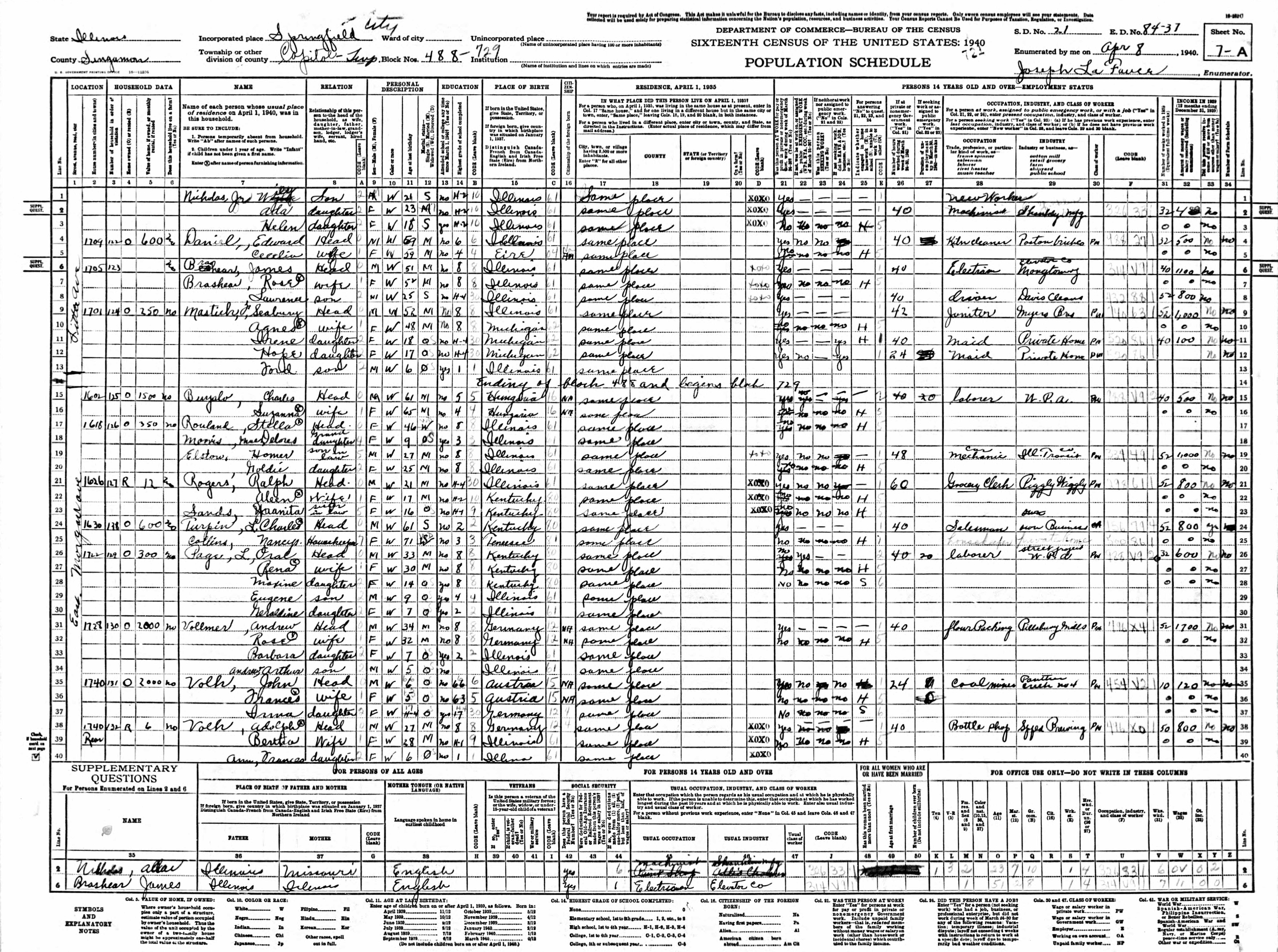 Volk Family 1940 Federal Census Illinois, Lines 35-40