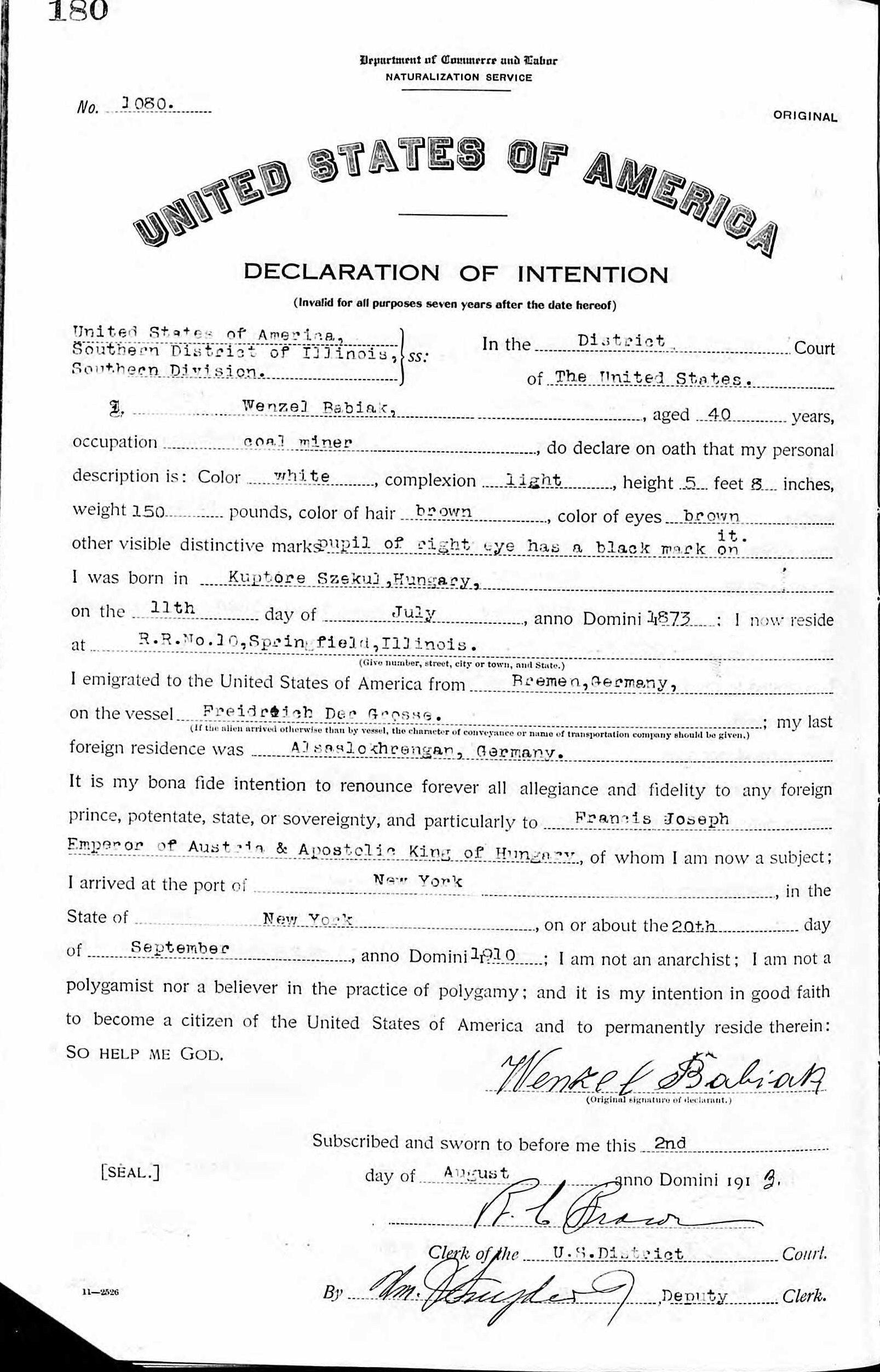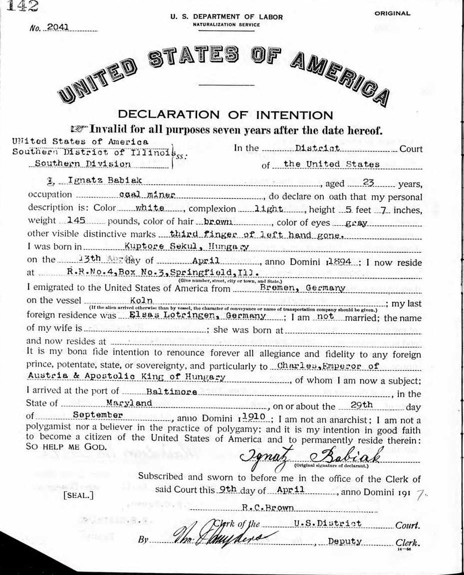 1913 Declaration of Intention Record