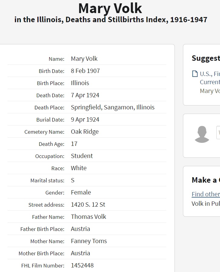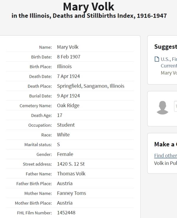 Mary Volk was born on February 8, 1907 in Gladbeck, Recklinghausen, North Rhine-Westphalia, Germany. She died on April 7, 1924, at age 17, in Springfield, Sangamon, Illinois, USA. She was buried in Oak Ridge Cemetery, Springfield, Illinois.