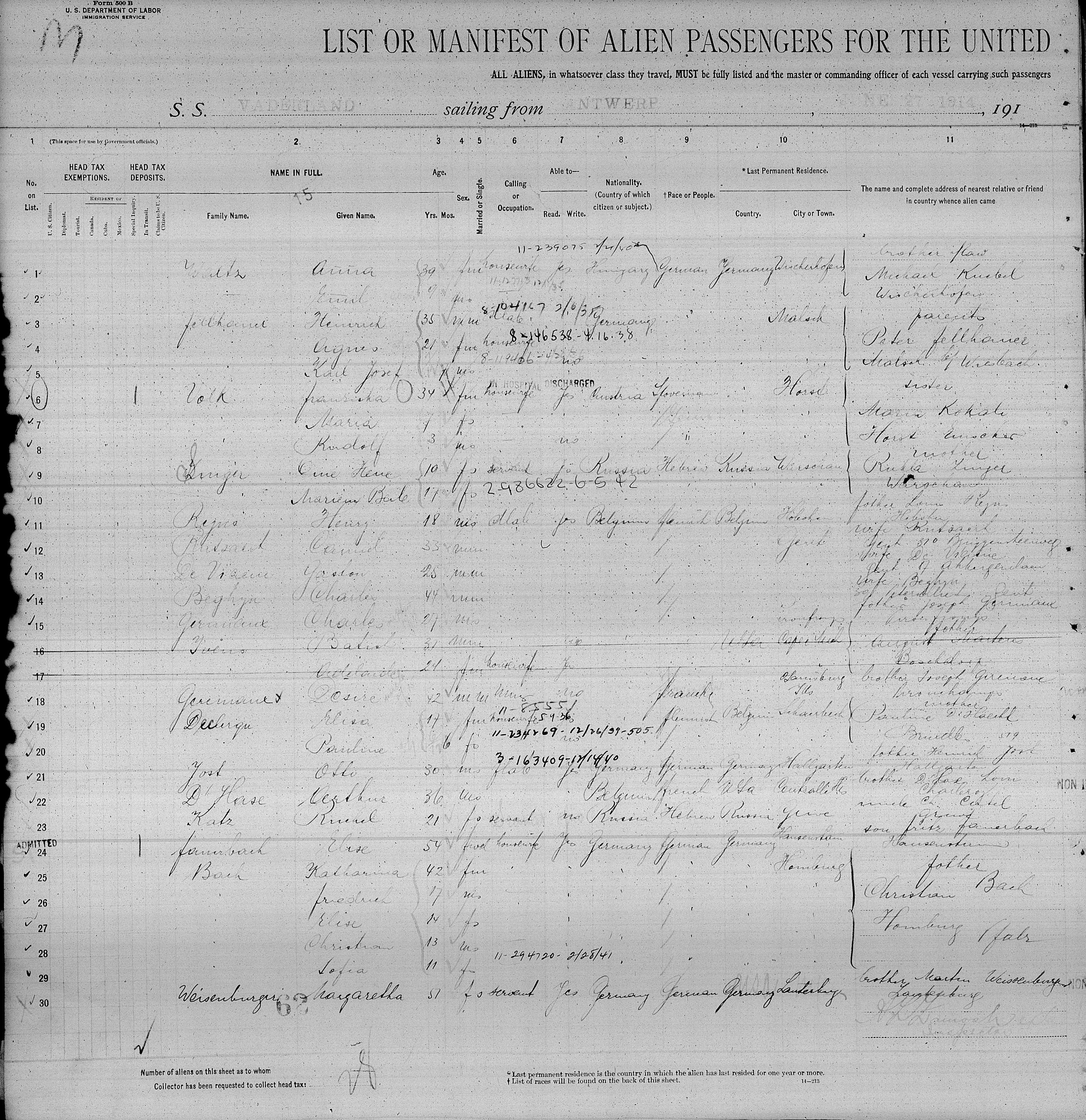 Volk Family 1914 Ship Departure Manifest, Lines 6-8