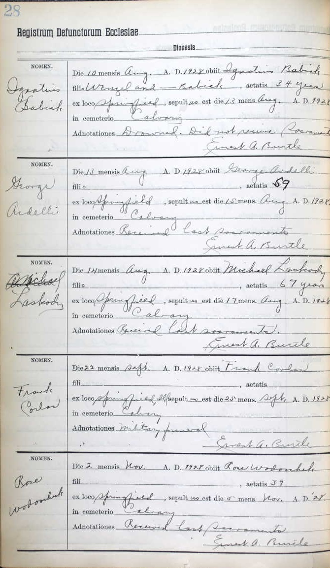 Amelia were married. He died on February 8, 1948, at age 74, in Springfield, Sangamon, Illinois, USA. He was buried in Calvary Cemetery, Springfield, Illinois.