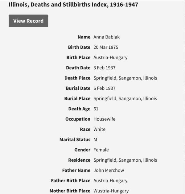 Wenzel Robert Babiak were married. She died on February 3, 1937, at age 61, in Springfield, Sangamon, Illinois, USA. She was buried in Calvary Cemetery, Springfield, Illinois.