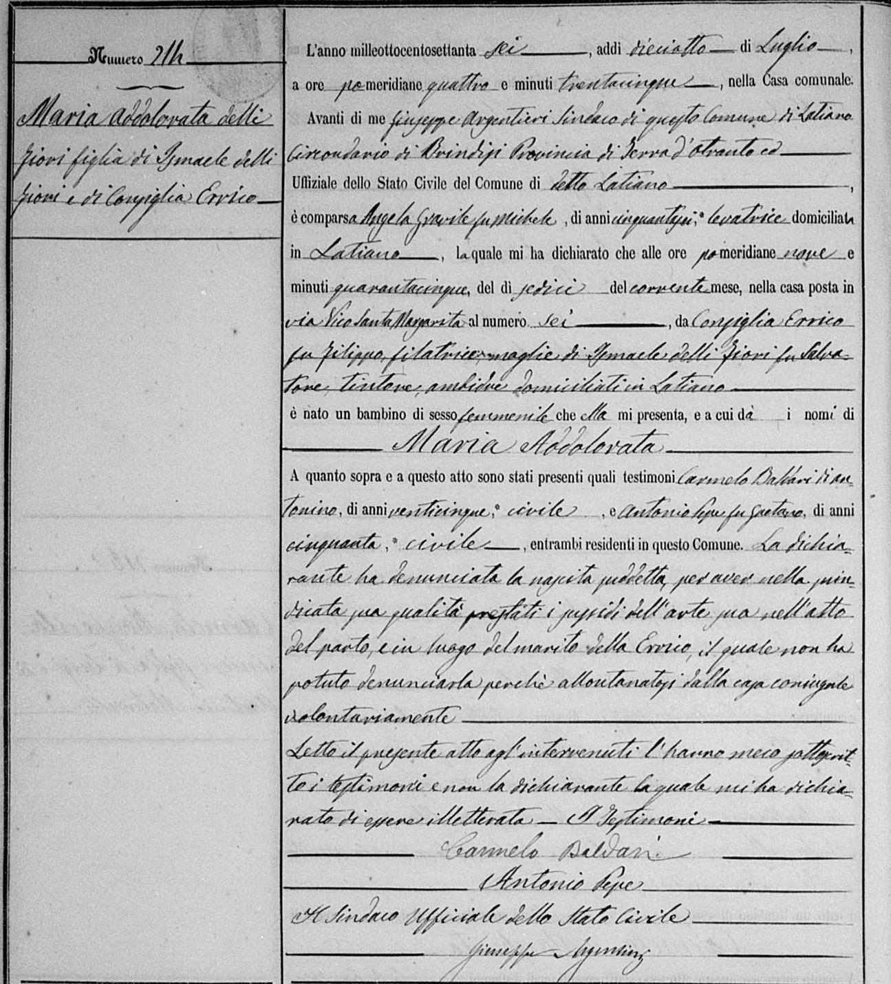 Maria Addolorata Delli Fiori was born on July 16, 1876 in Latiano, Brindisi, Puglia, Italy. She died.