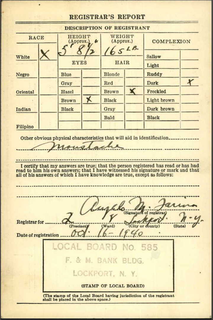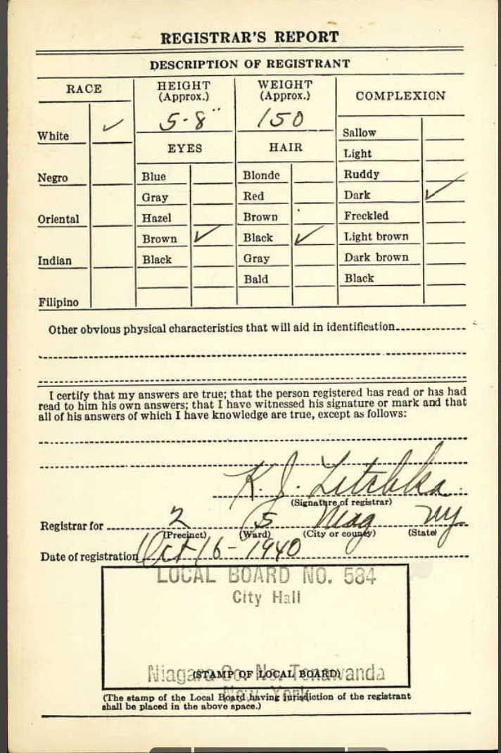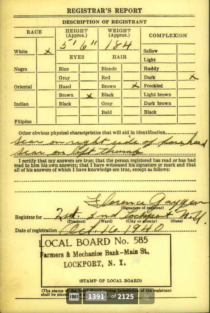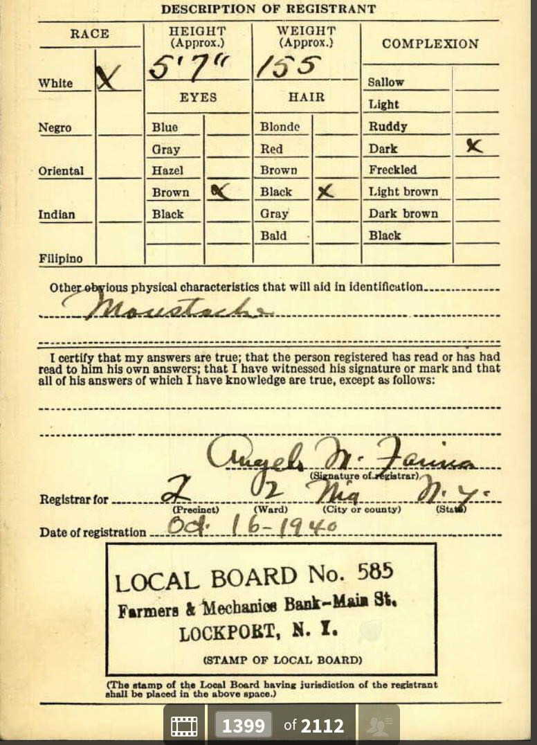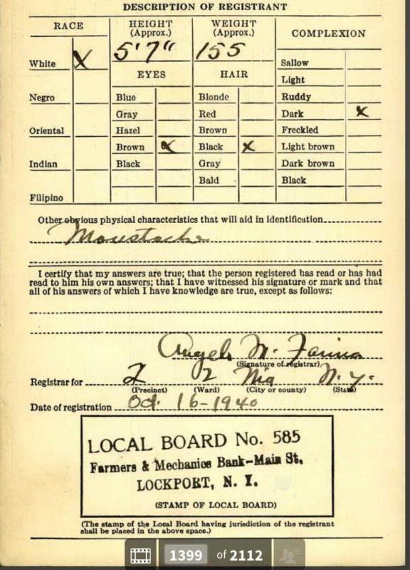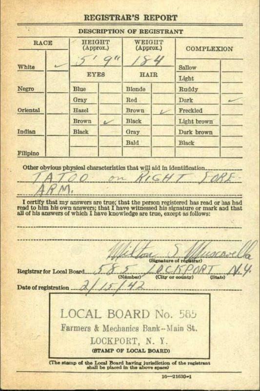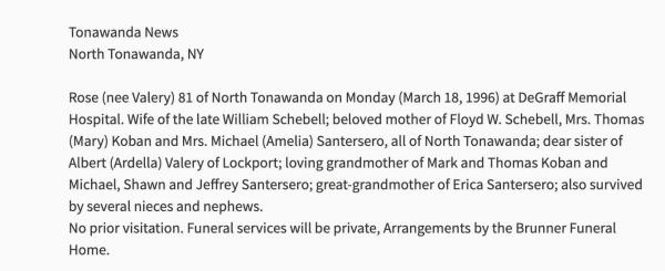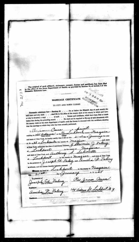 Rosa Amelia Valeri were married on November 4, 1939 in Lockport, Niagara, New York, USA. He died in July 1987, at age 78, in North Tonawanda, Niagara, New York, USA. He was buried in Mount Olivet Cemetery, Kenmore, New York.