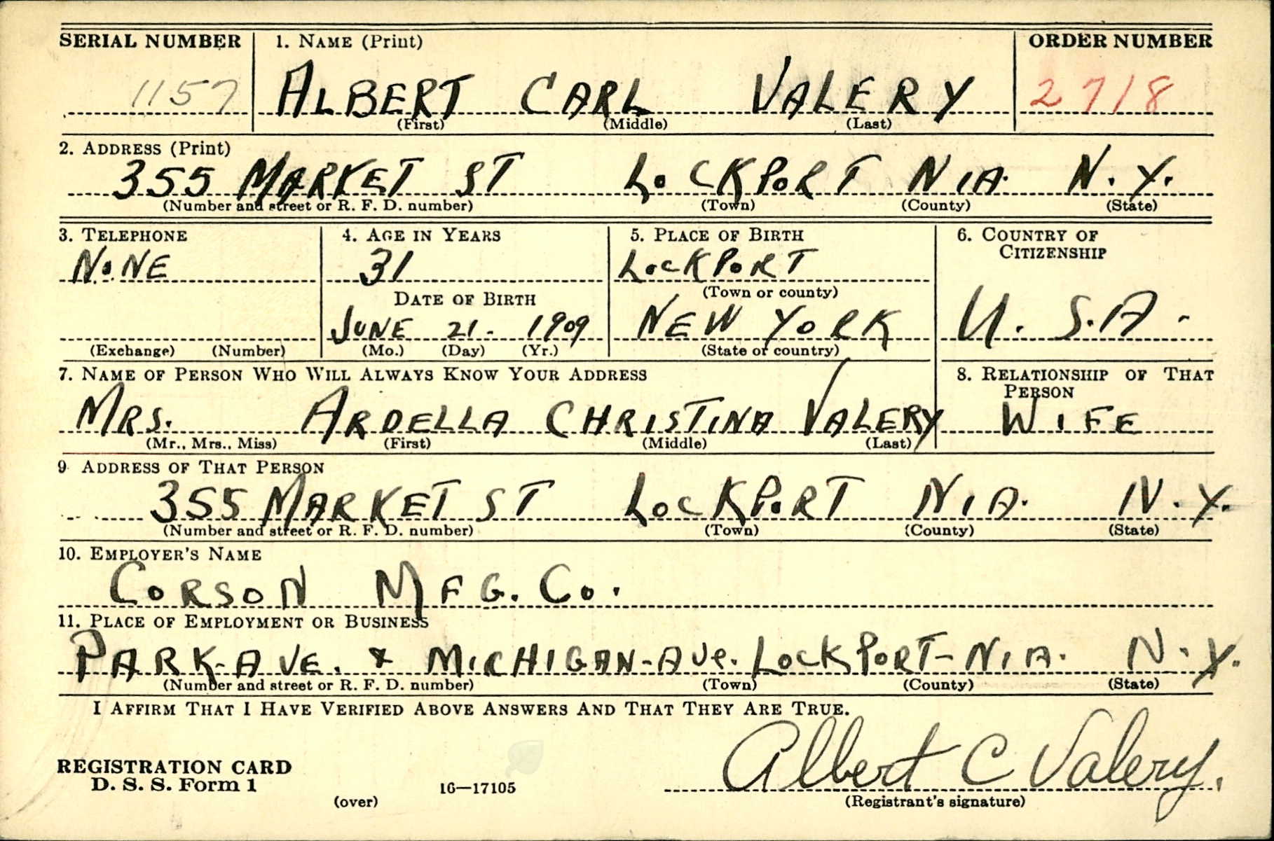 Albert Carl Valeri was born on June 21, 1909 in Lockport, Niagara, New York, USA. He and