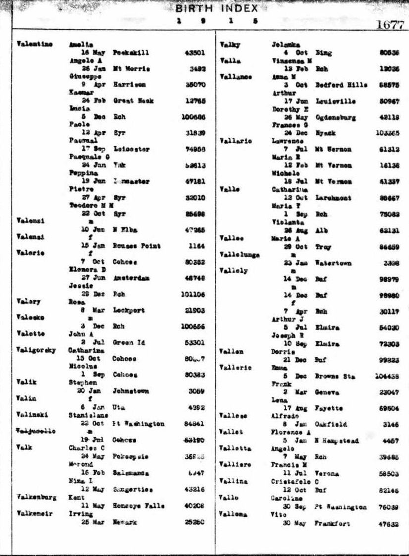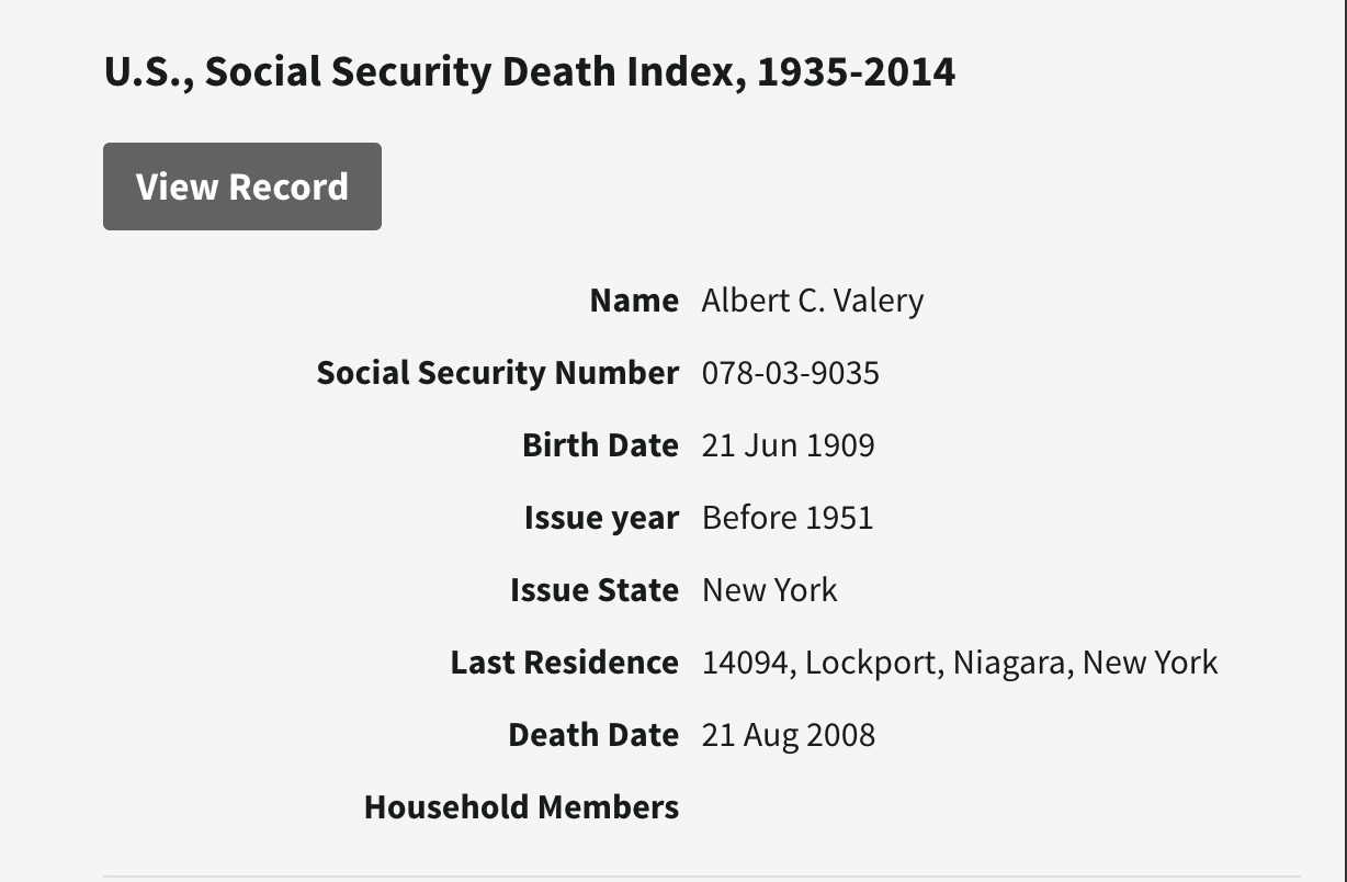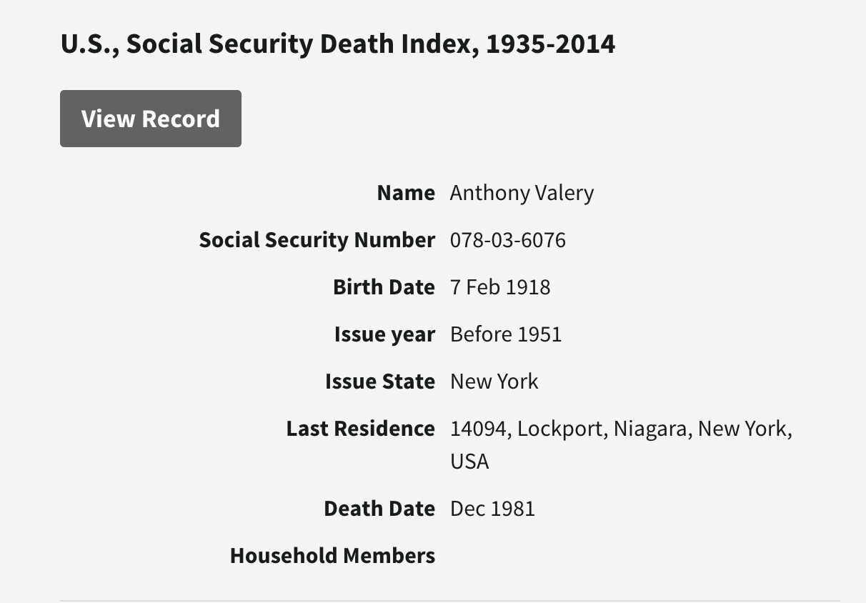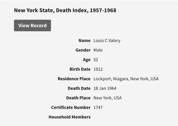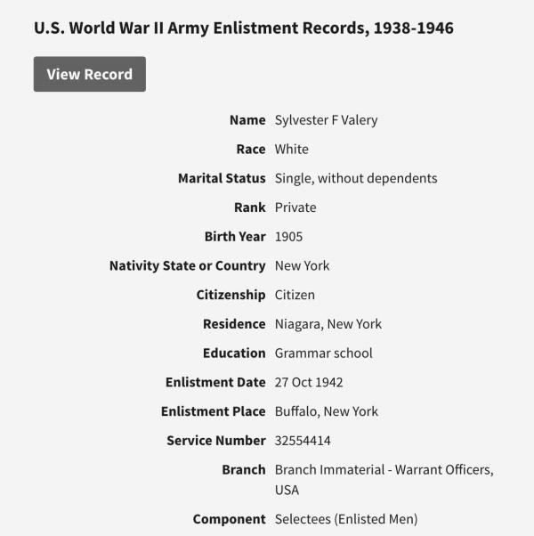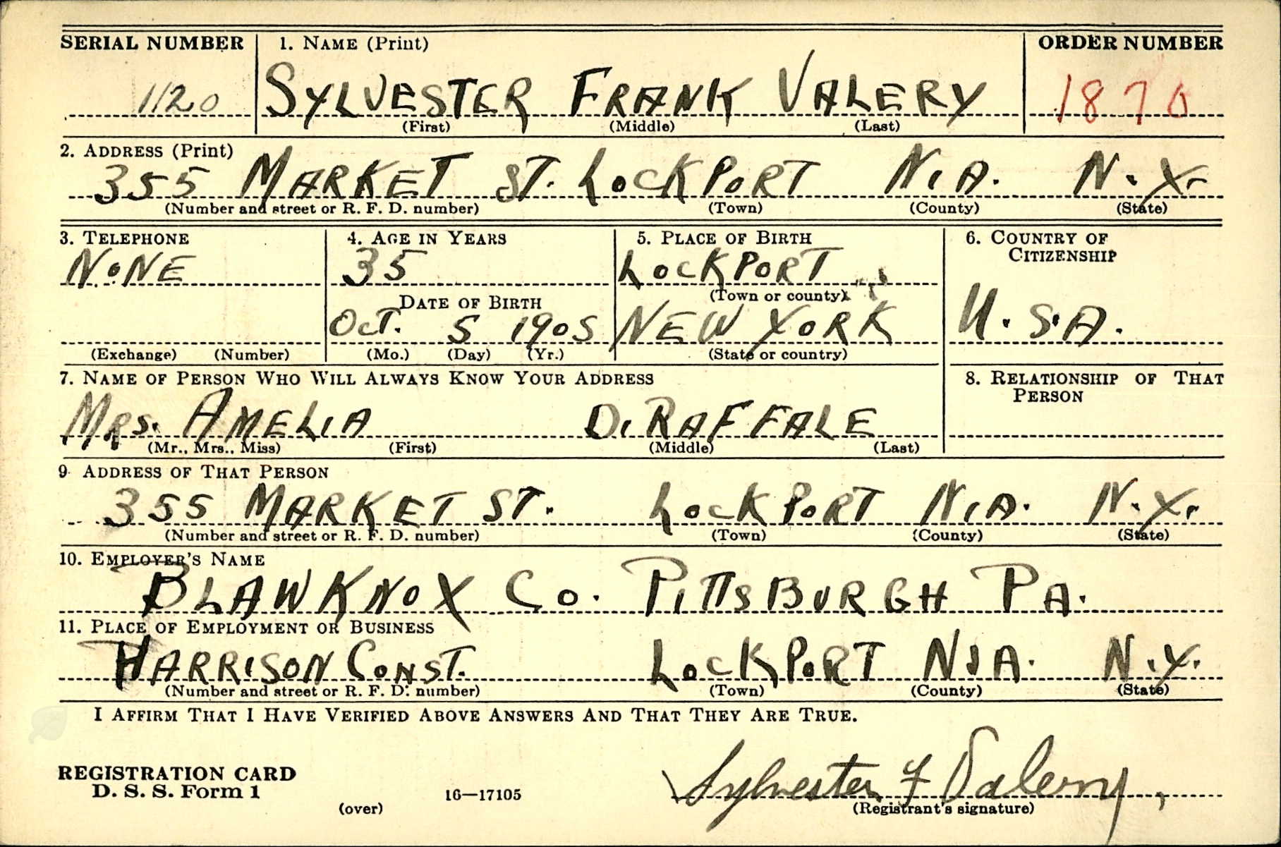 Silvester Frank Valeri was born on October 5, 1905 in Lockport, Niagara, New York, USA. He died in 1978, at age ~73. He was buried in Cold Springs Cemetery, Lockport, New York.