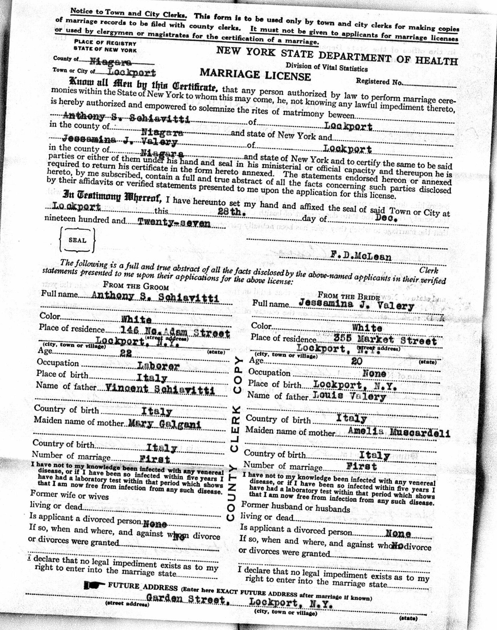 Severino Antonio Schiavitti were married on January 21, 1928 in Lockport, Niagara, New York, USA. She died in January 1982, at age 74, in Lockport, Niagara, New York, USA. She was buried in Saint Patrick's Cemetery, Lockport, New York.