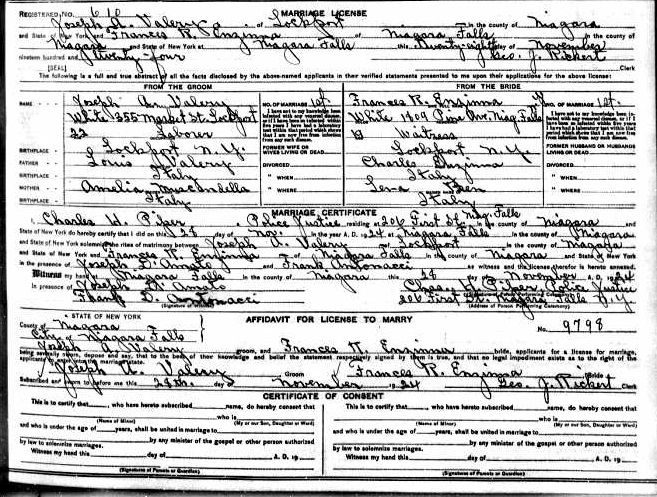 Jessamina J. Valeri were married on January 21, 1928 in Lockport, Niagara, New York, USA. He died on February 23, 1963, at age 57, in Lockport, Niagara, New York, USA. He was buried in Saint Patrick's Cemetery, Lockport, New York.