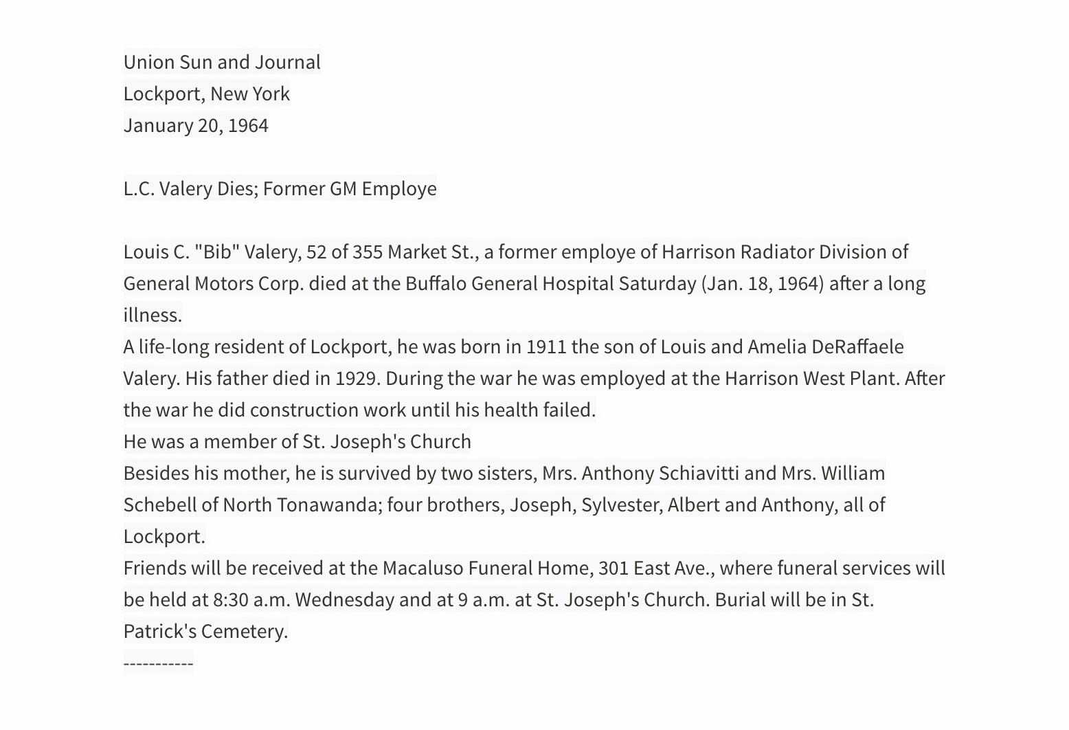 Luigi Carl "Bib" Valeri was born on June 21, 1911 in Lockport, Niagara, New York, USA. He died on January 18, 1964, at age 52, in Buffalo, Erie, New York, USA. He was buried in Saint Patrick's Cemetery, Lockport, New York.
