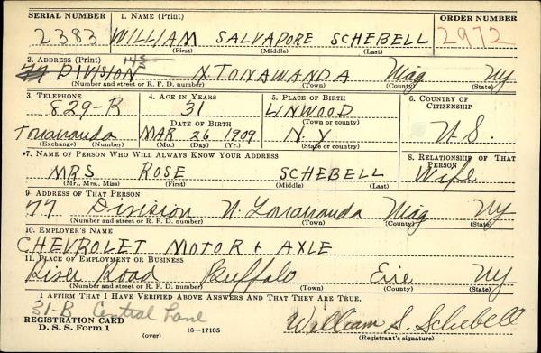 Salvatore "William" Scibelli (Schebell) was born on March 26, 1909 in Linwood, Genesee, New York, USA. He and