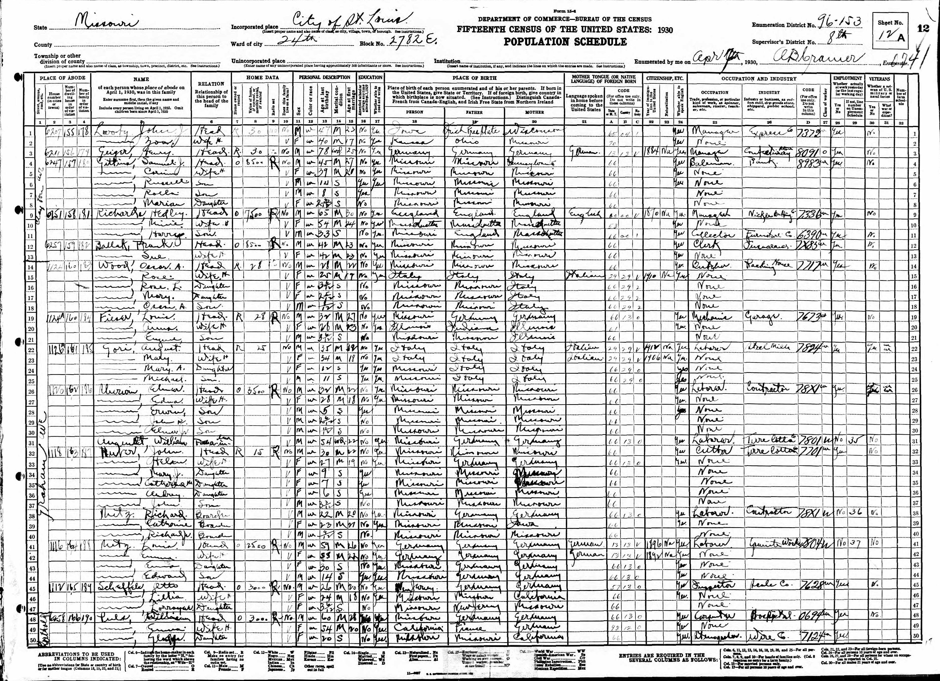 Gori Family 1930 Federal Census Missouri, Lines 22-25