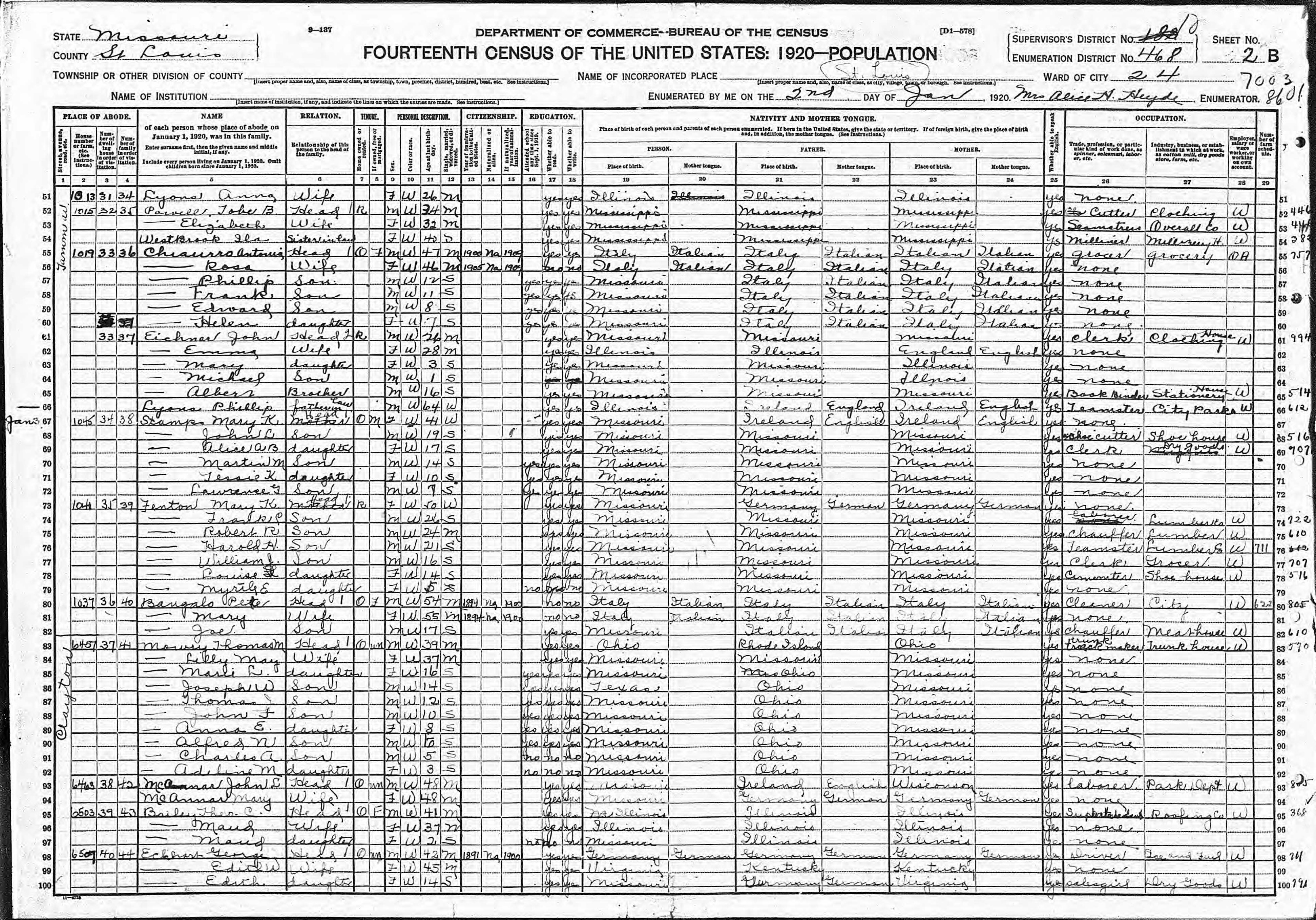Ciaurro Family 1920 Federal Census Missouri, Lines 55-60