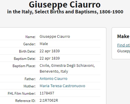 Giuseppe Ciaurro was born on April 22, 1839 in Ginestra degli Schiavoni, Benevento, Campania, Italy. He died.
