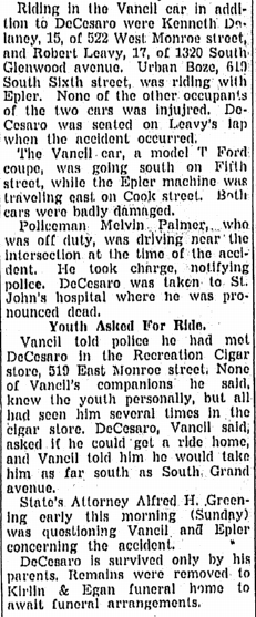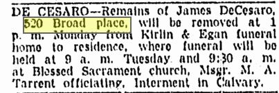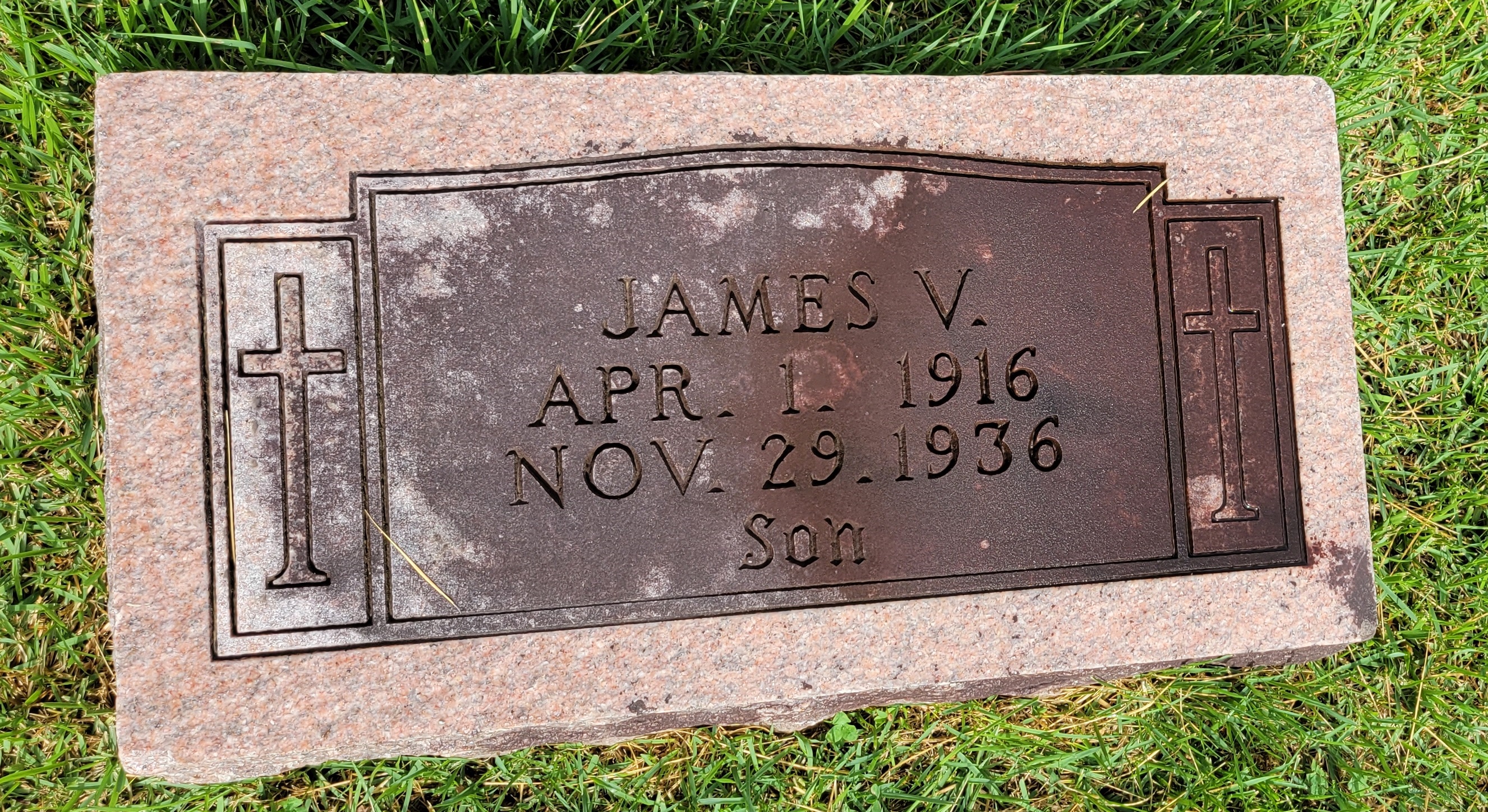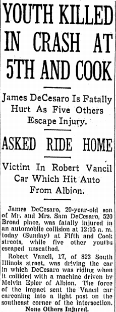 James V. De Cesare (De Cesaro) was born on April 1, 1916 in Springfield, Sangamon, Illinois, USA. He died on November 29, 1936, at age 20, in Springfield, Sangamon, Illinois, USA. He was buried in Calvary Cemetery, Springfield, Illinois.