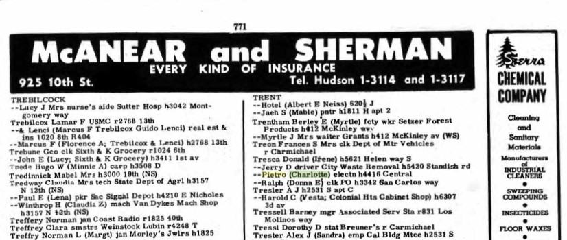 Pietro Vincenzo Donato Tresca were married on September 16, 1950 in Sacramento, Sacramento, California, USA. She died on January 5, 1985, at age 75, in Sacramento, Sacramento, California, USA.