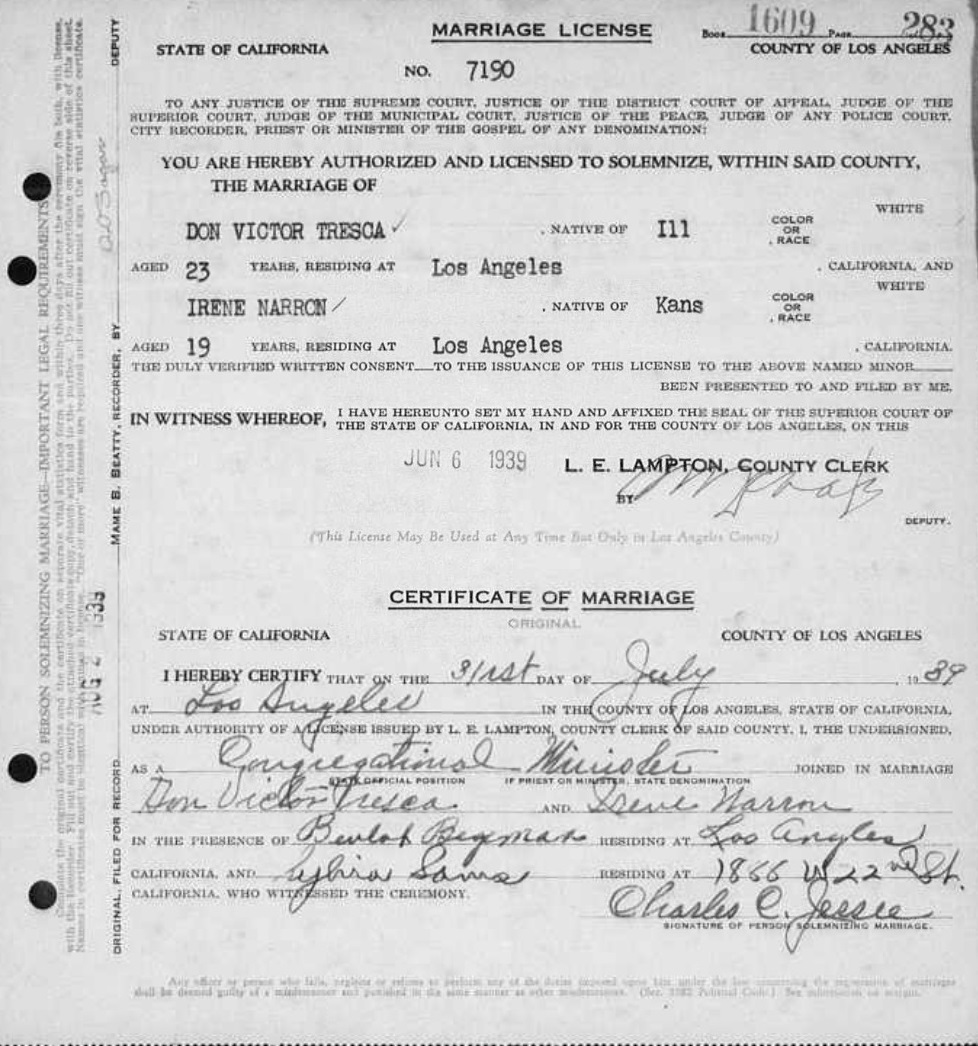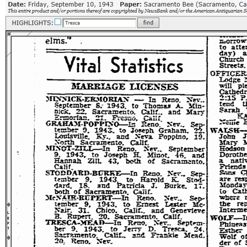 Girolamo "Jerry" Dominic Tresca, Sr., were married on September 9, 1943 in Reno, Washoe, Nevada, USA.