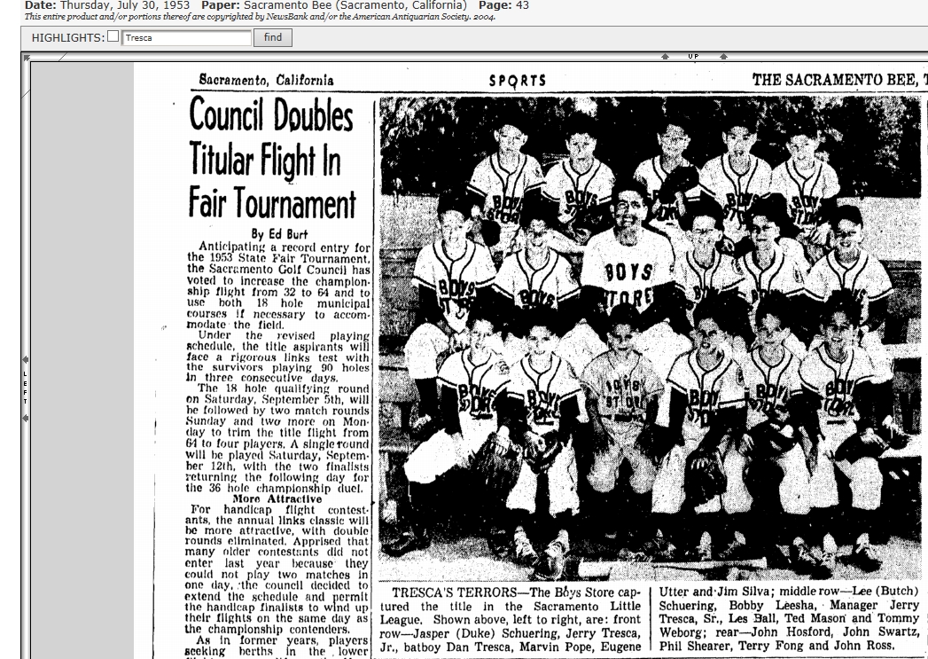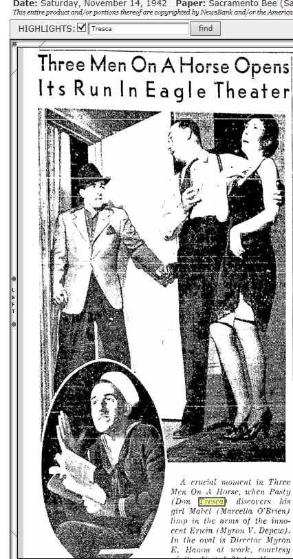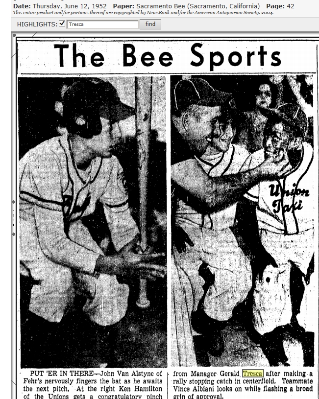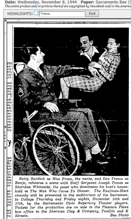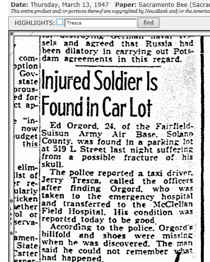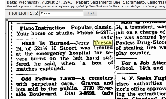 Dominic Victor Tresca were married on August 2, 1939 in Los Angeles, Los Angeles, California, USA. She died on March 24, 1999, at age 79, in Sacramento, Sacramento, California, USA. She was buried in Old Fellows Lawn Cemetery, Sacarmento, California.