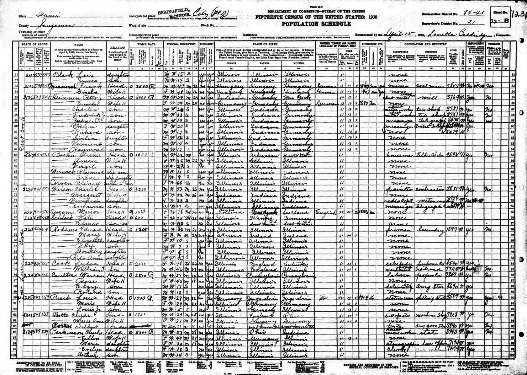 Heinen Family 1930 Federal Census Illinois, Lines 55-64