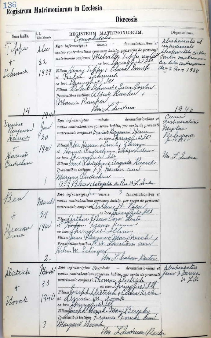 Vincent Raymond Heinen were married on January 20, 1940 in Springfield, Sangamon, Illinois, USA. She died on September 27, 1998, at age 83, in Springfield, Sangamon, Illinois, USA. She was buried in Oak Ridge Cemetery, Springfield, Illinois.