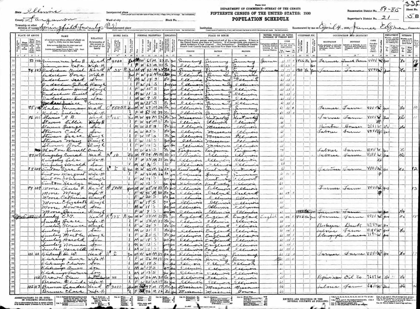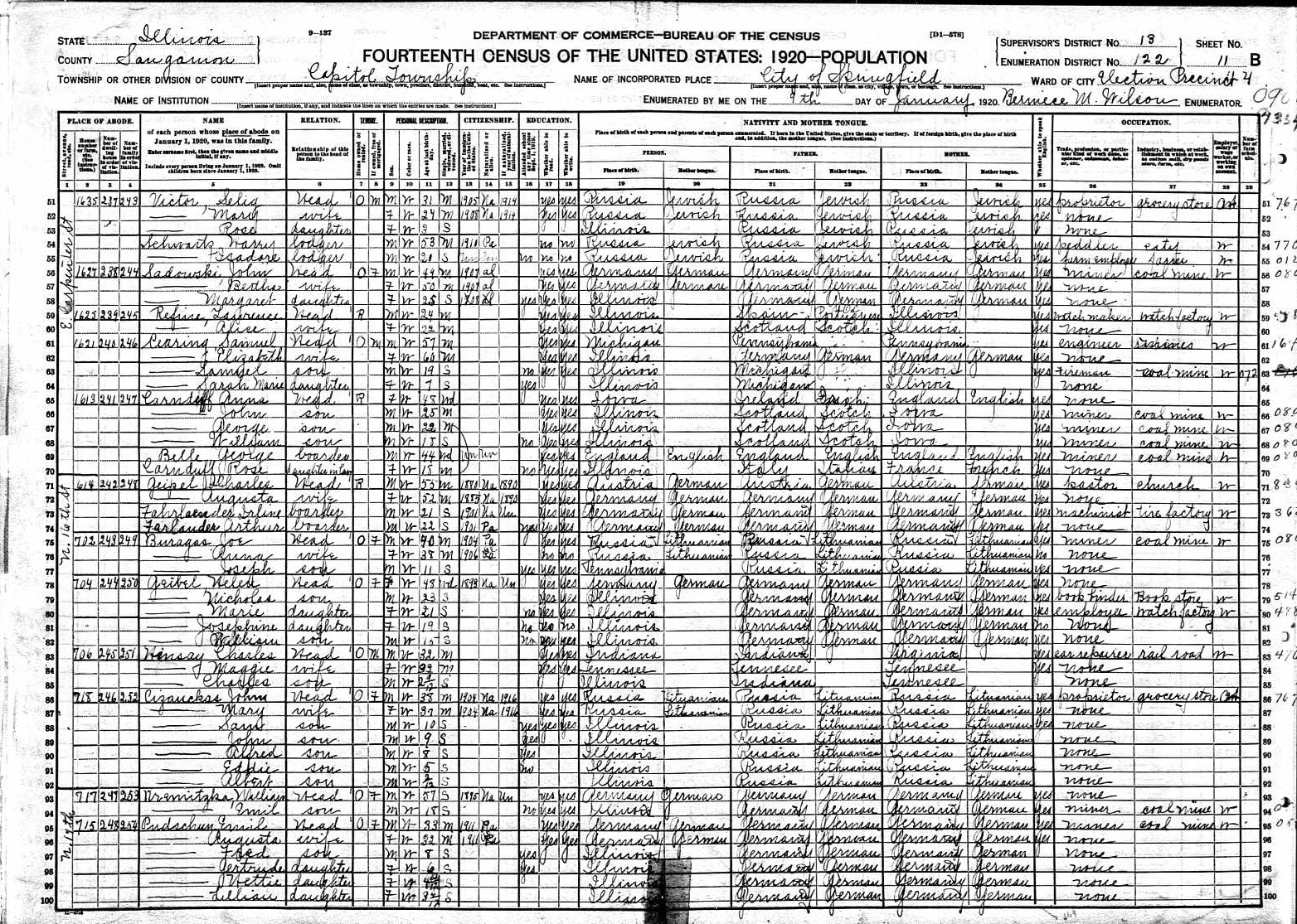 Pudschun Family 1920 Federal Census Illinois, Lines 95-100