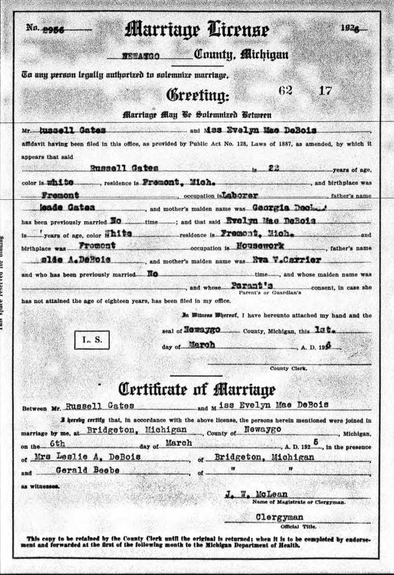 Russell Allen Gates, Sr., were married on March 6, 1926 in Bridgeton, Newaygo, Michigan, USA. She died on June 16, 1968, at age ~59, in Croton, Newaygo, Michigan, USA. She was buried in Bridgeton Township Cemetery, Bridgeton, Michigan.