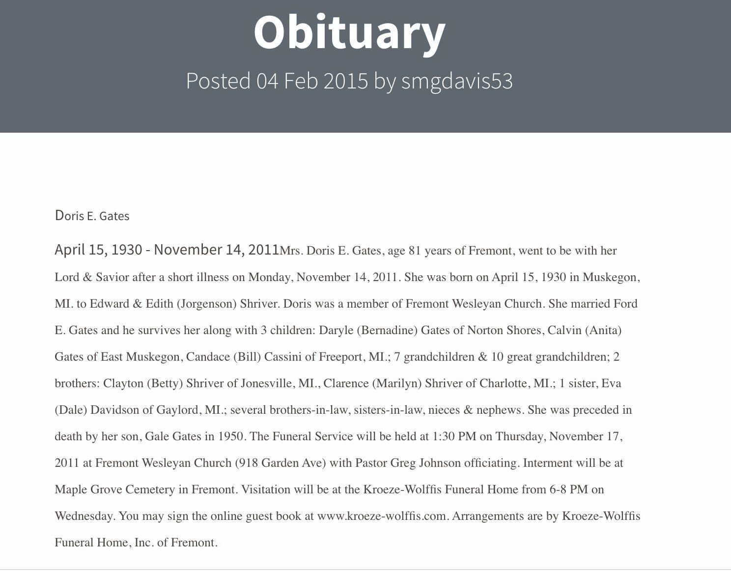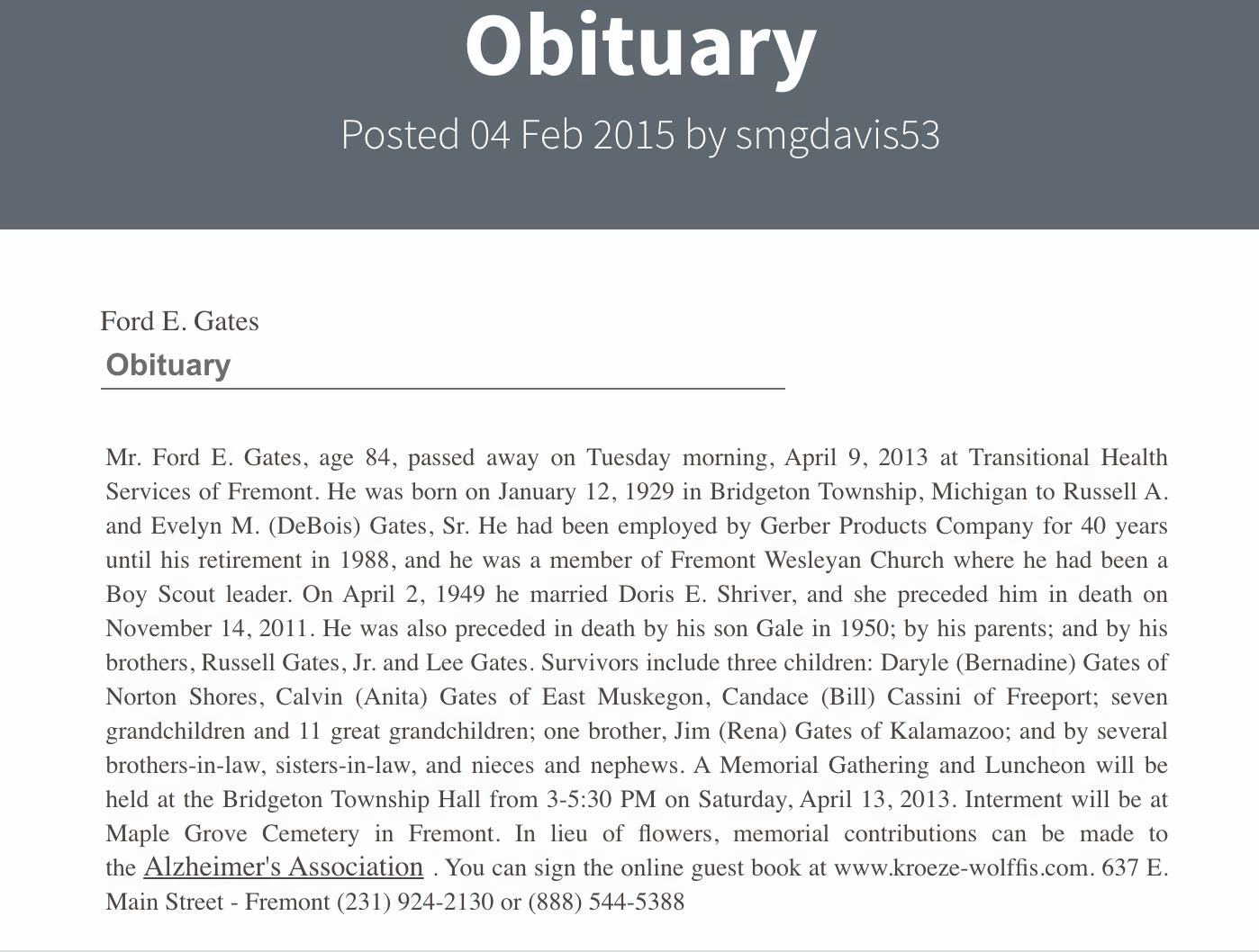 Ford Elmer Gates were married on April 2, 1949 in Fremont, Newaygo, Michigan, USA. She died on November 14, 2011, at age 81, in Fremont, Newaygo, Michigan, USA. She was buried in Maple Grove Cemetery, Fremont, Michigan.