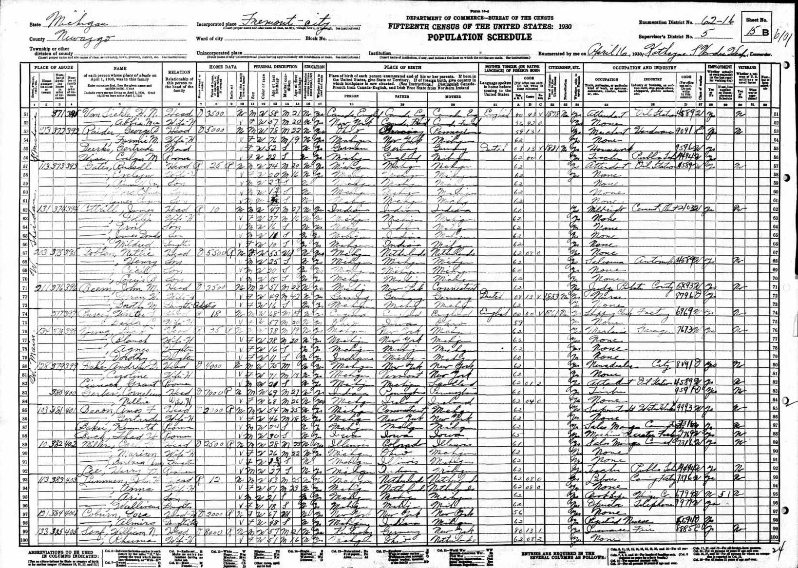 Gates Family 1930 Federal Census Michigan, Lines 57-61