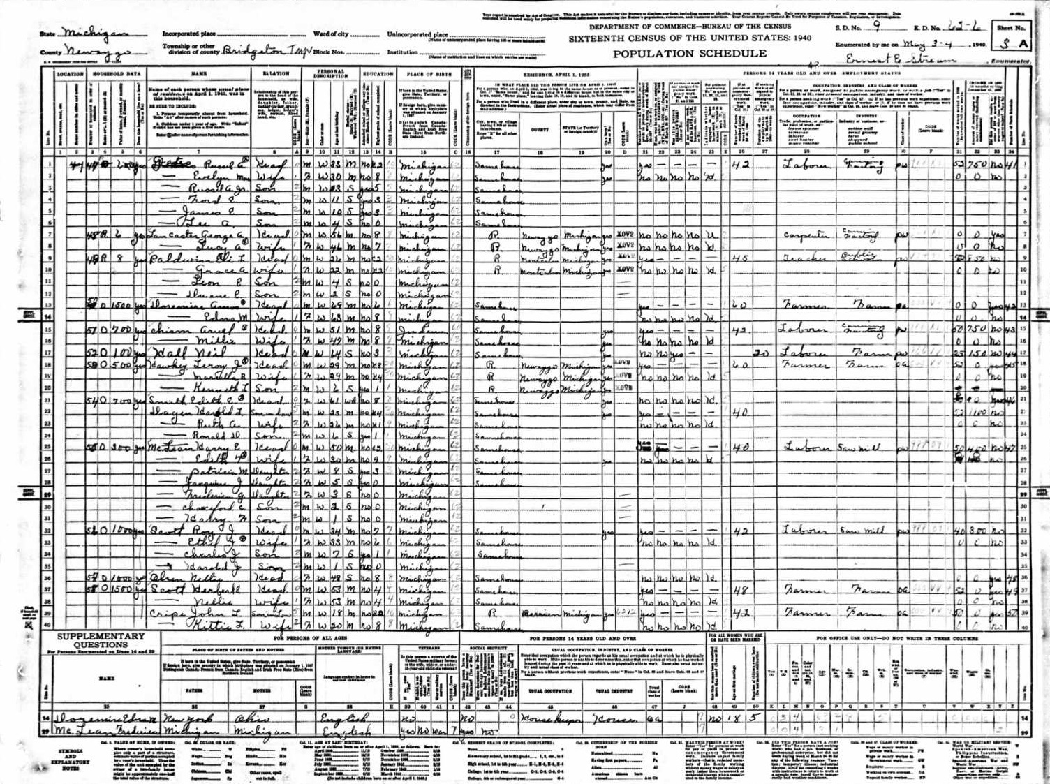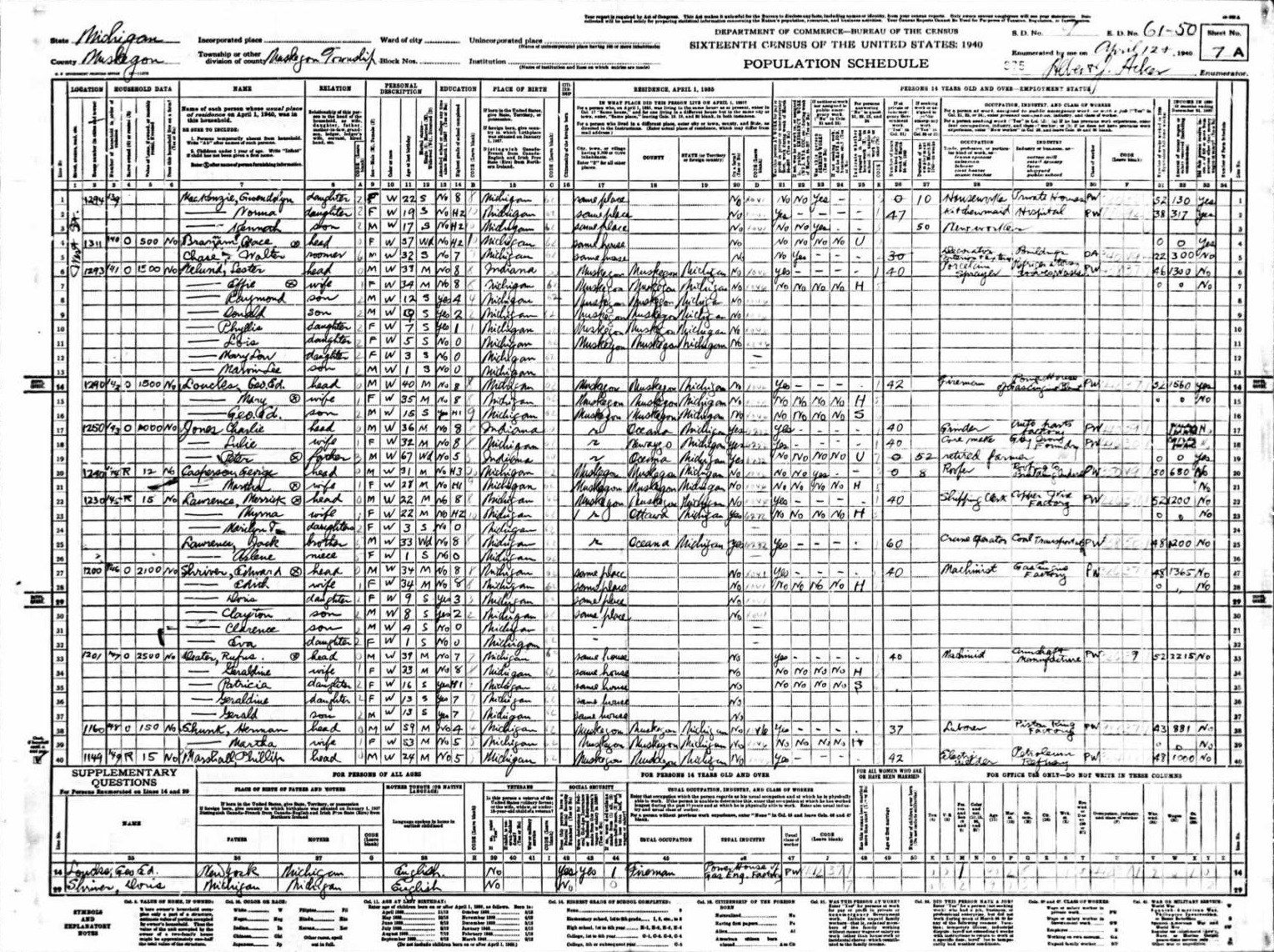 Shriver Family 1940 Federal Census Michigan, Lines 27-32