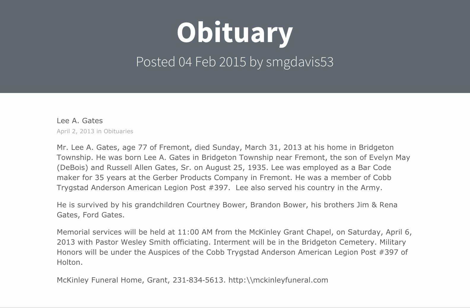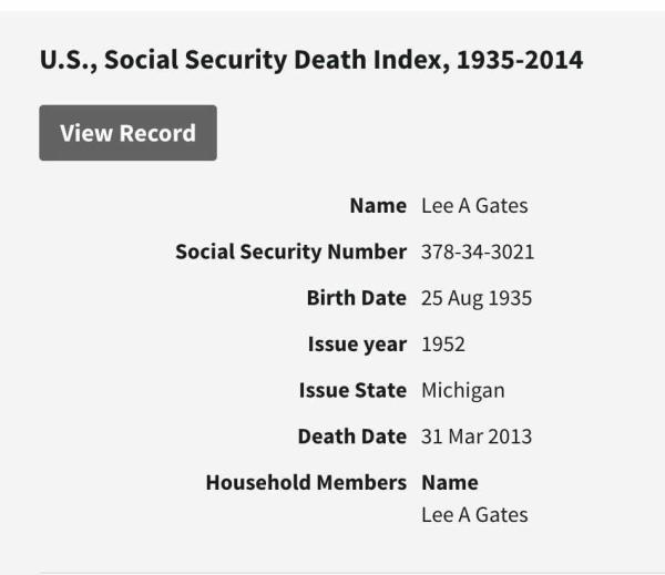 Lee Auburn Gates was born on August 25, 1935 in Bridgeton, Newaygo, Michigan, USA. He died on March 31, 2013, at age 77, in Fremont, Newaygo, Michigan, USA. He was buried in Bridgeton Township Cemetery, Bridgeton, Michigan.