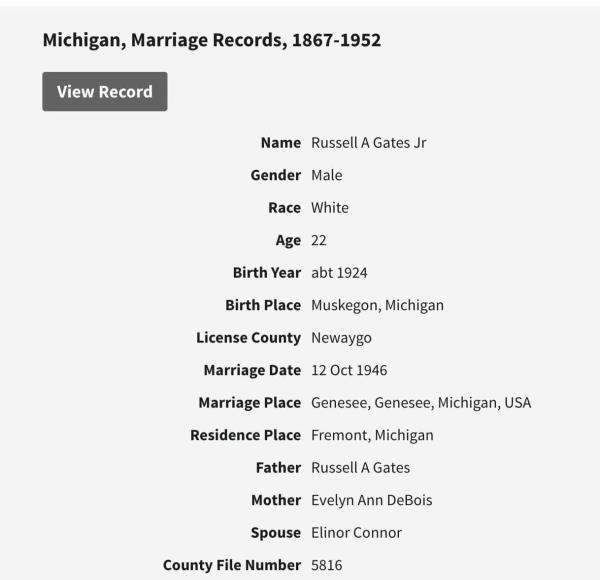 Russell Allen Gates, Jr., were married on October 12, 1946 in Genesee, Genesee, Michigan, USA.