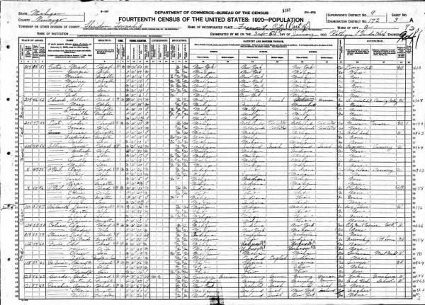 Gates Family 1920 Federal Census Michigan, Lines 1-7