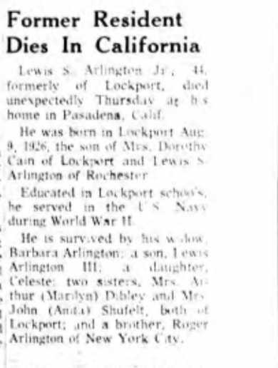 Lewis Stanley Arlington, Jr., was born on August 9, 1926 in Lockport, Niagara, New York, USA. He and