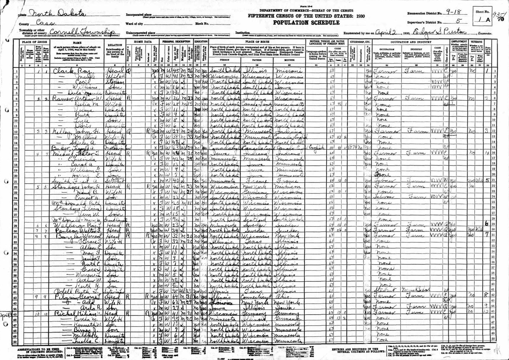 Kelley Family 1930 Federal Census North Dakota, Lines 12-15