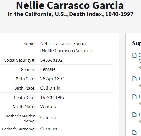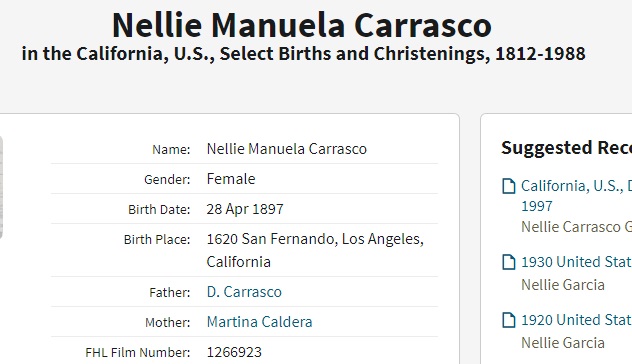 Nellie Manuela Carasco was born on April 28, 1897 in San Fernando, Los Angeles, California, USA. She and