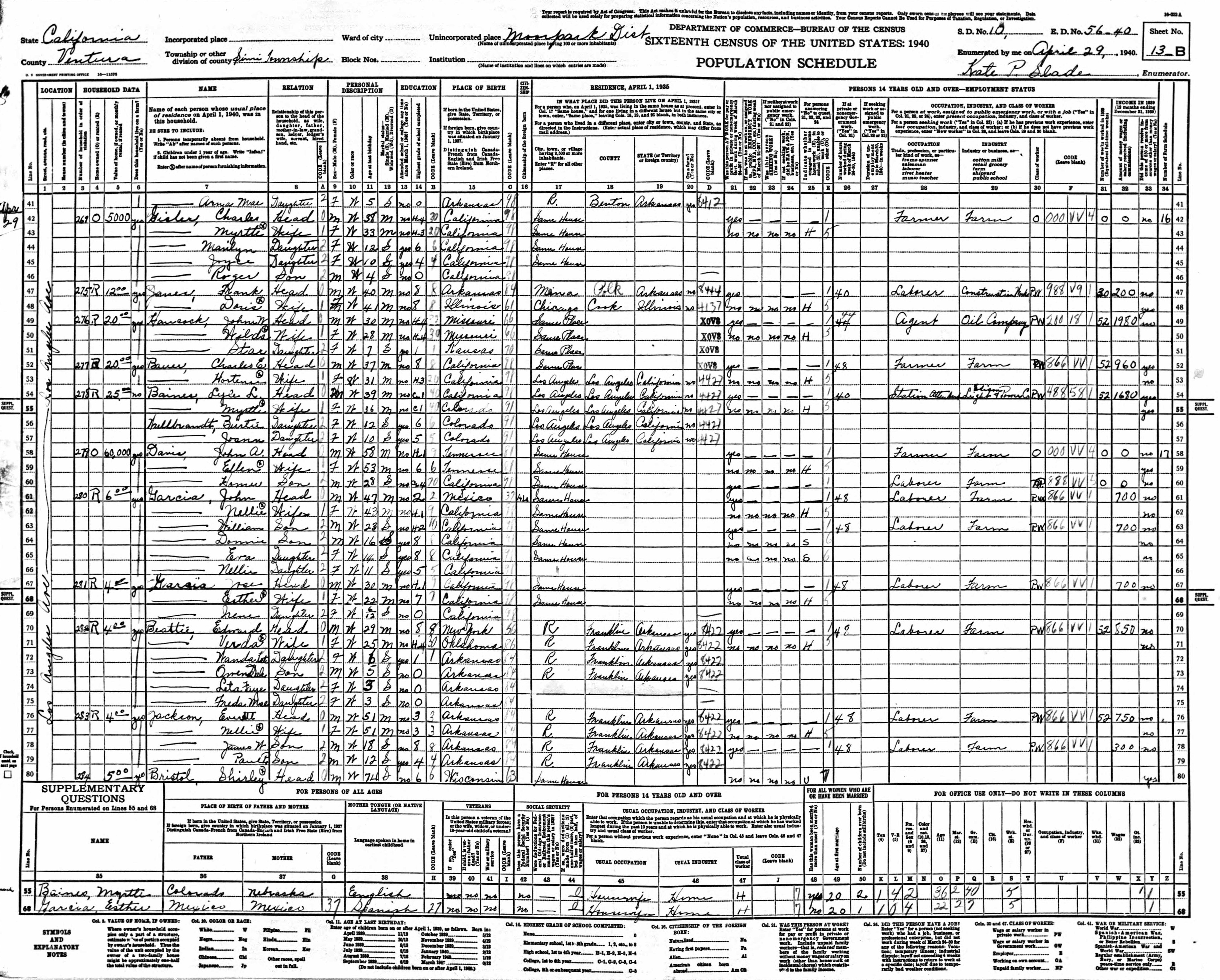 Garcia Family 1940 Federal Census California, Lines 61-66