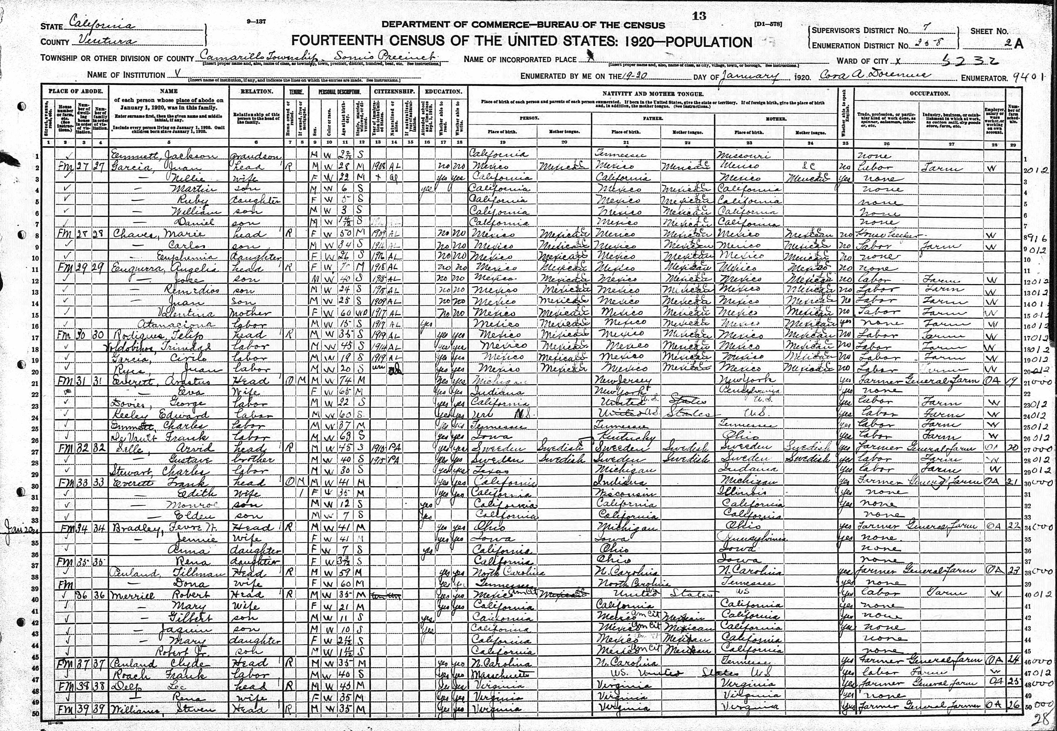 Garcia Family 1920 Federal Census California, Lines 2-7