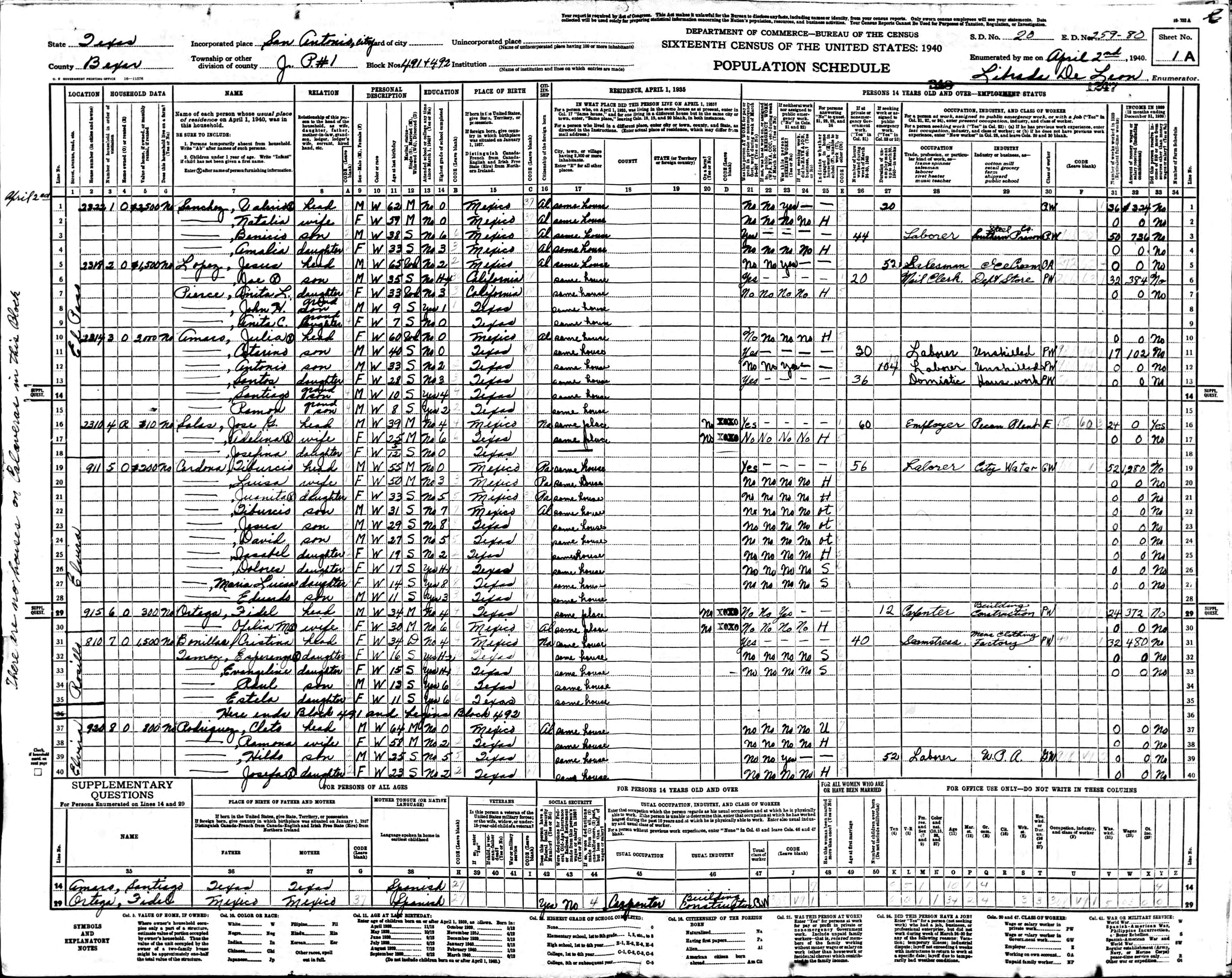 Lopez Family 1940 Federal Census Texas, Lines 5-10