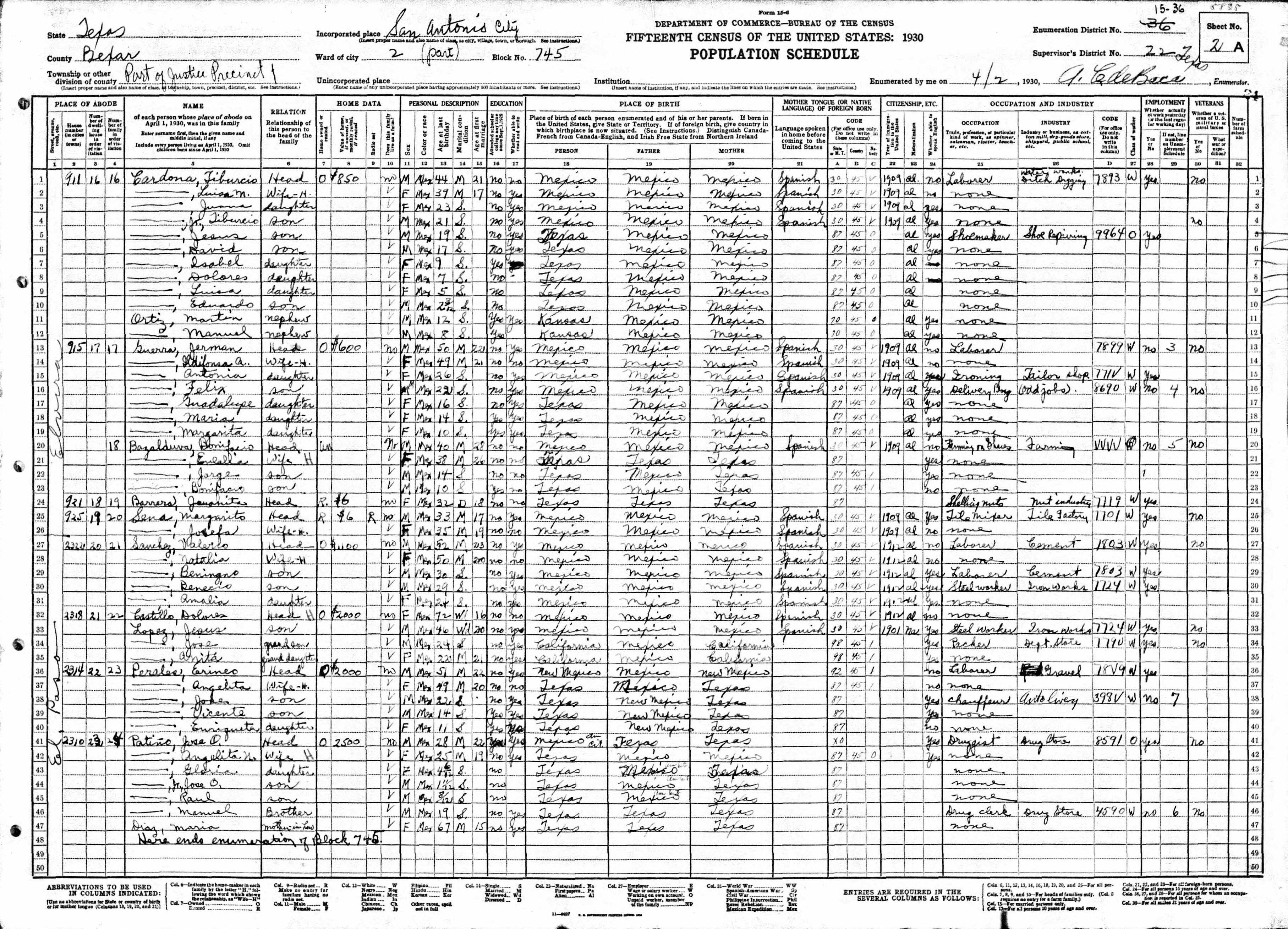 Lopez Family 1930 Federal Census Texas, Lines 32-35