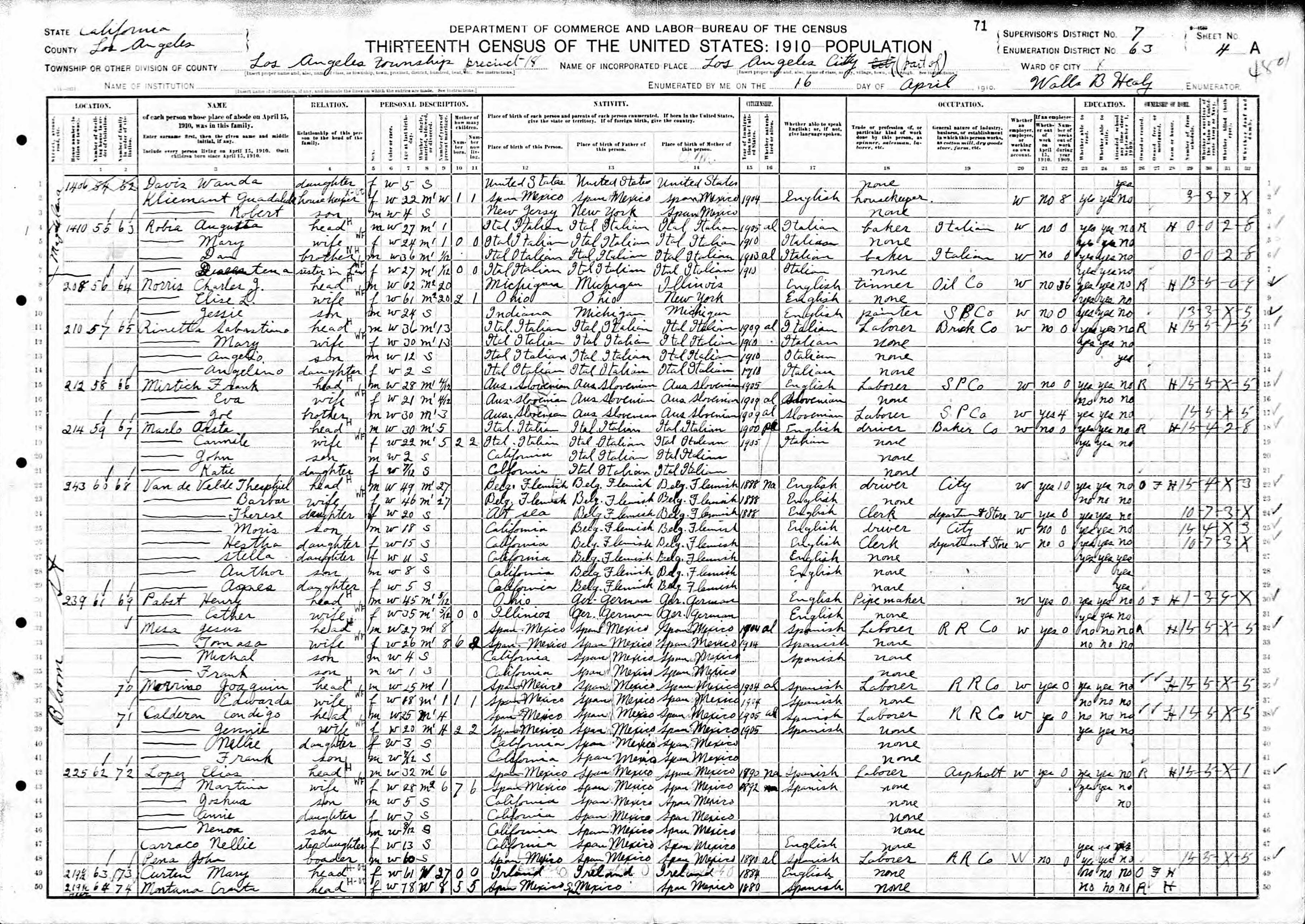 Lopez Family 1910 Federal Census California, Lines 42-48