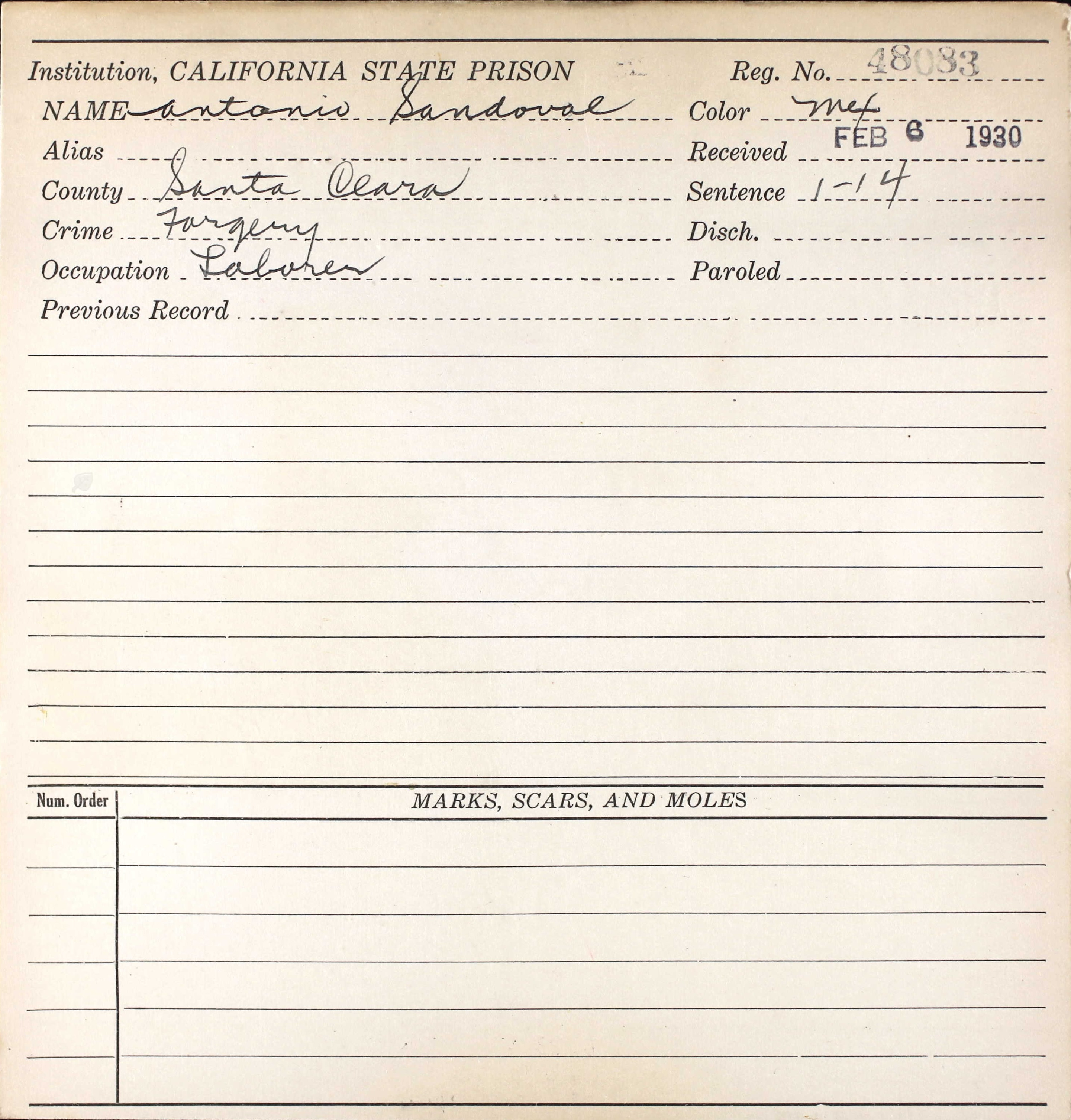 Antonio Sandoval 1930 Federal Census San Quentin Prison California, Line 87