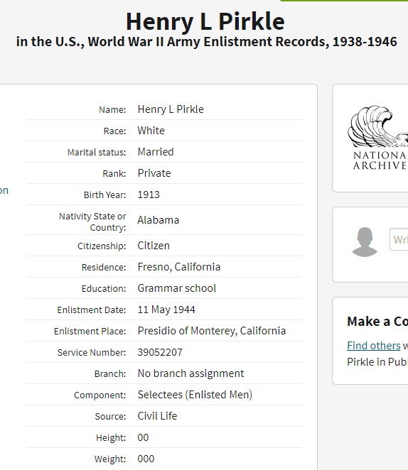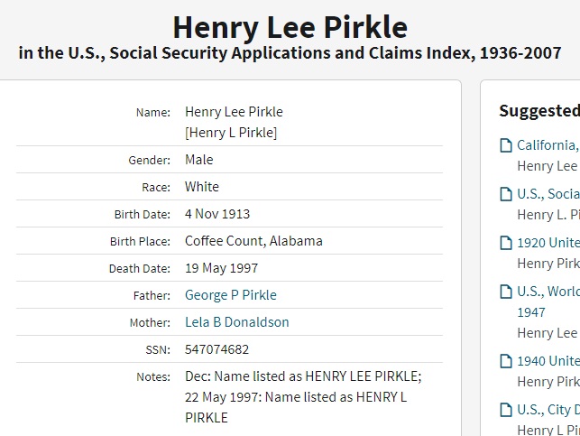 Henry Lee Pirkle was born on November 4, 1913 in Coffee, Alabama, USA. He and