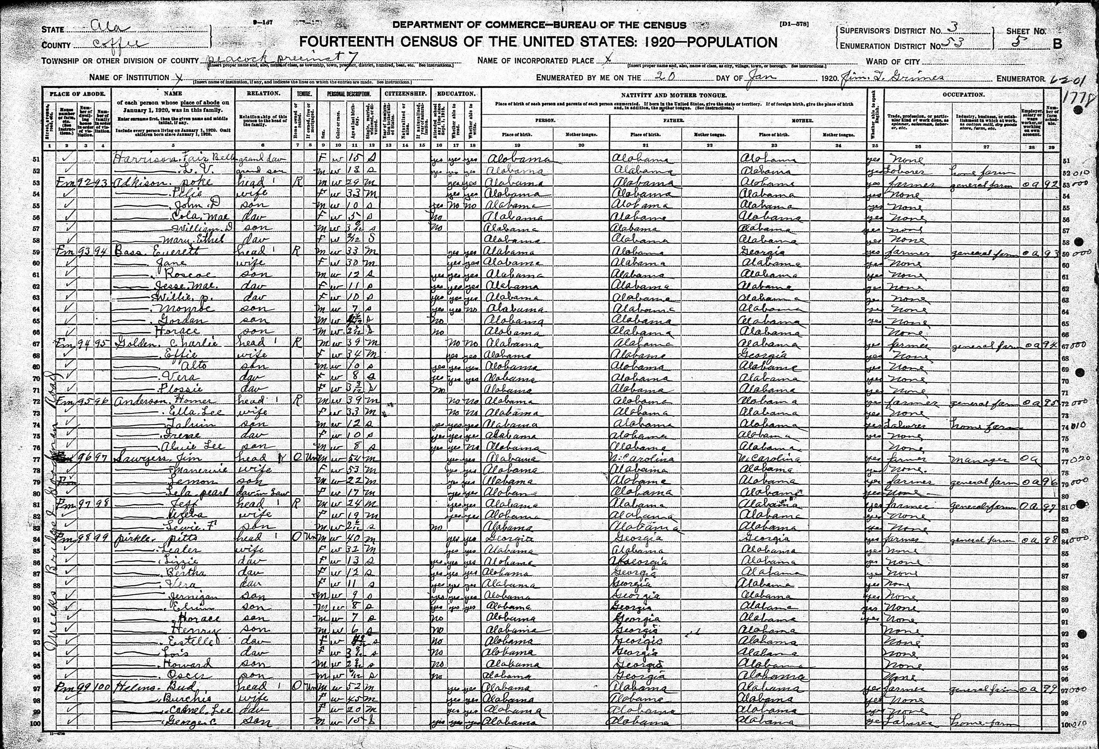 Pirkle Family 1920 Federal Census Alabama, Lines 84-96